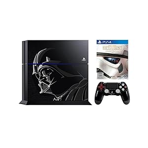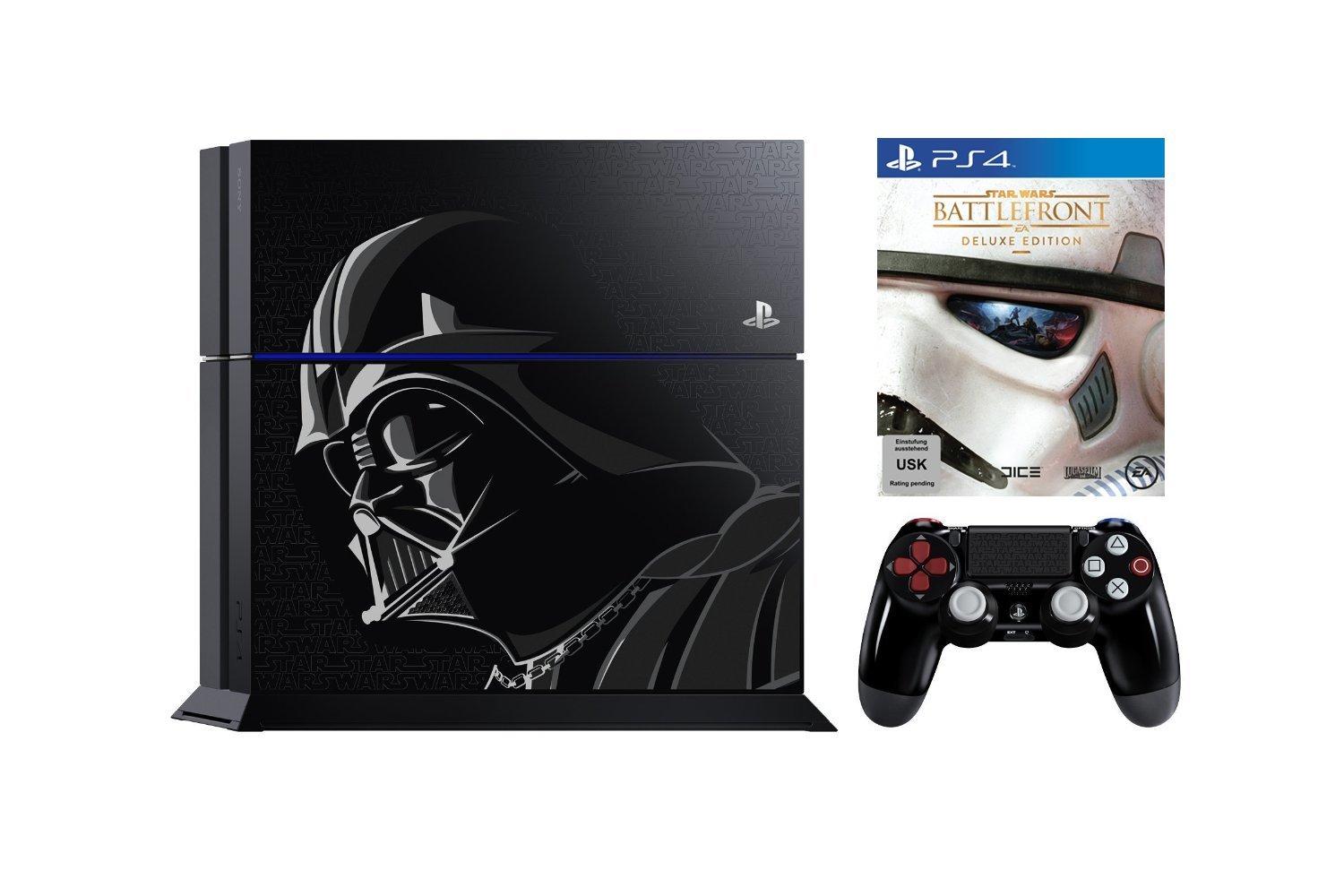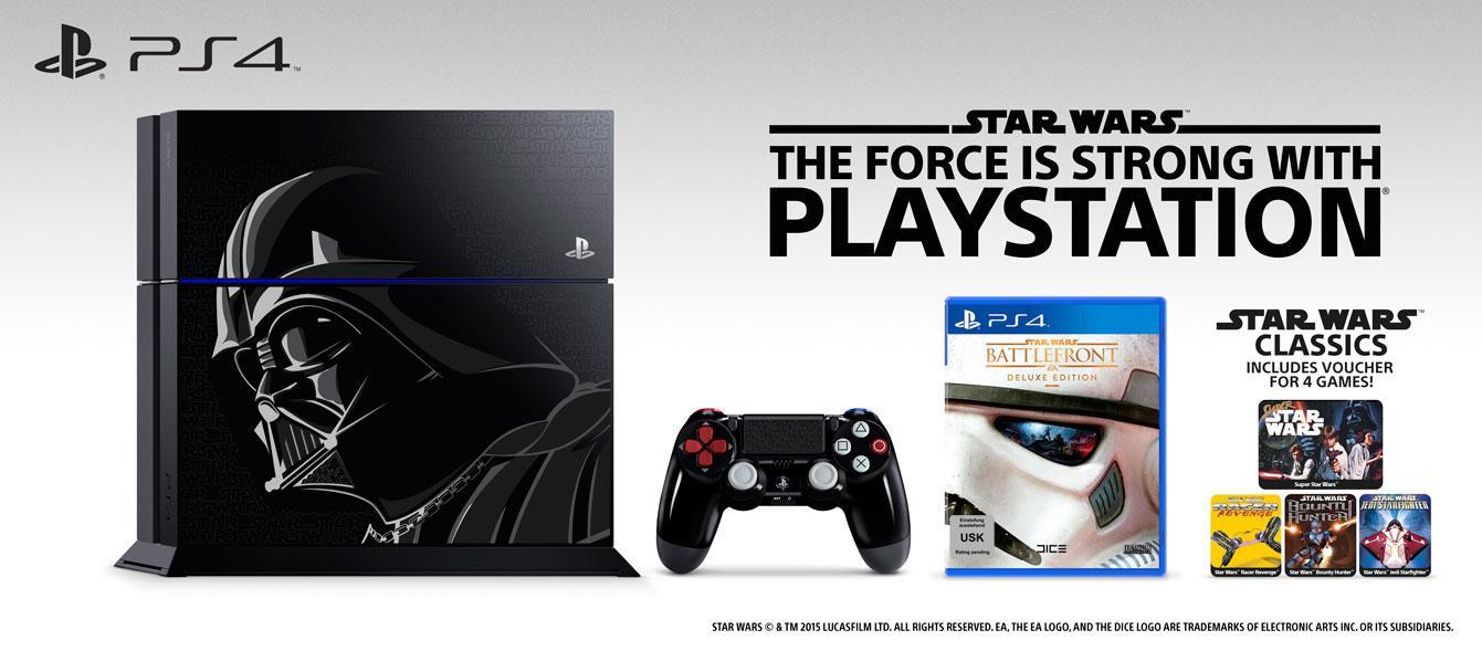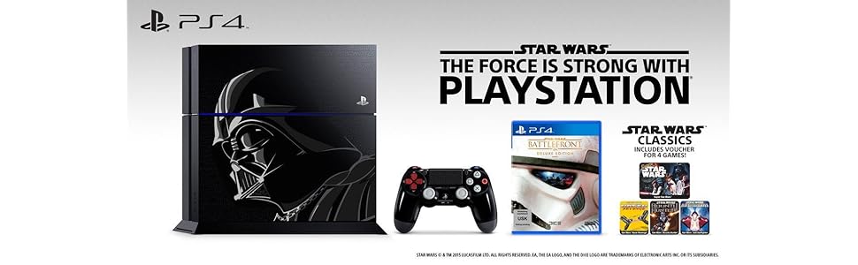 Das Limited Edition Star Wars Battlefront PS4-Bundle wird ein stilvolles 1TB Limited Edition PS4-System im Darth Vader-Stil und einen passenden Wireless DualShock 4-Controller beinhalten. Die komplett angepasste PS4 zeigt ein Bild von Darth Vader, sowie sowie das Star Wars-Logo an der Oberfläche des Systems. Der Controller ist von Darth Vaders Anzug inspiriert und bildet am Touchpad das Star Wars-Logo ab. **Das Bundle beinhaltet außerdem eine physische Kopie von Star Wars Battlefront: Deluxe Edition sowie einen digitalen Gutschein-Code für vier Star-Wars-Titel: Super Star Wars, Star Wars: Racer Revenge, Jedi Starfighter und Star Wars Bounty Hunter – erstmals auf der PS4 spielbar, mit verbesserter Grafik und Trophäen-Unterstützung. **Die Star Wars Battlefront Deluxe Edition ermöglicht das Freischalten von fünf zusätzlichen Ingame-Items: *- Ermöglicht das Beschädigen von Fahrzeuge mit dem Ionendetonator noch stärker. *- Erfasst und zerstört gegnerische Vehikel mit dem Ionentorpedo. *- Ermöglicht, dass man mit Han Solos berühmten DL-44-Blaster zum ultimativen Halunken wird. *- Schaltet den exklusiven Ionenschock-Emote zum Elektrifizieren frei. *- Siege können mit dem exklusiven Sieg-Emote gefeiert werden.