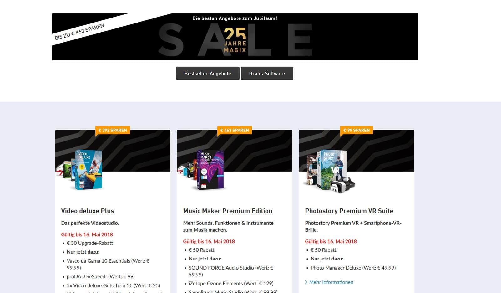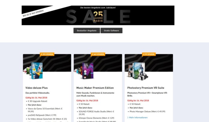 Sichern Sie sich nur jetzt bis 16. Mai 2018 unschlagbare Jubiläums-Deals – z.B. mit Video deluxe Plus, Photostory Premium VR Suite und Music Maker Premium Edition!