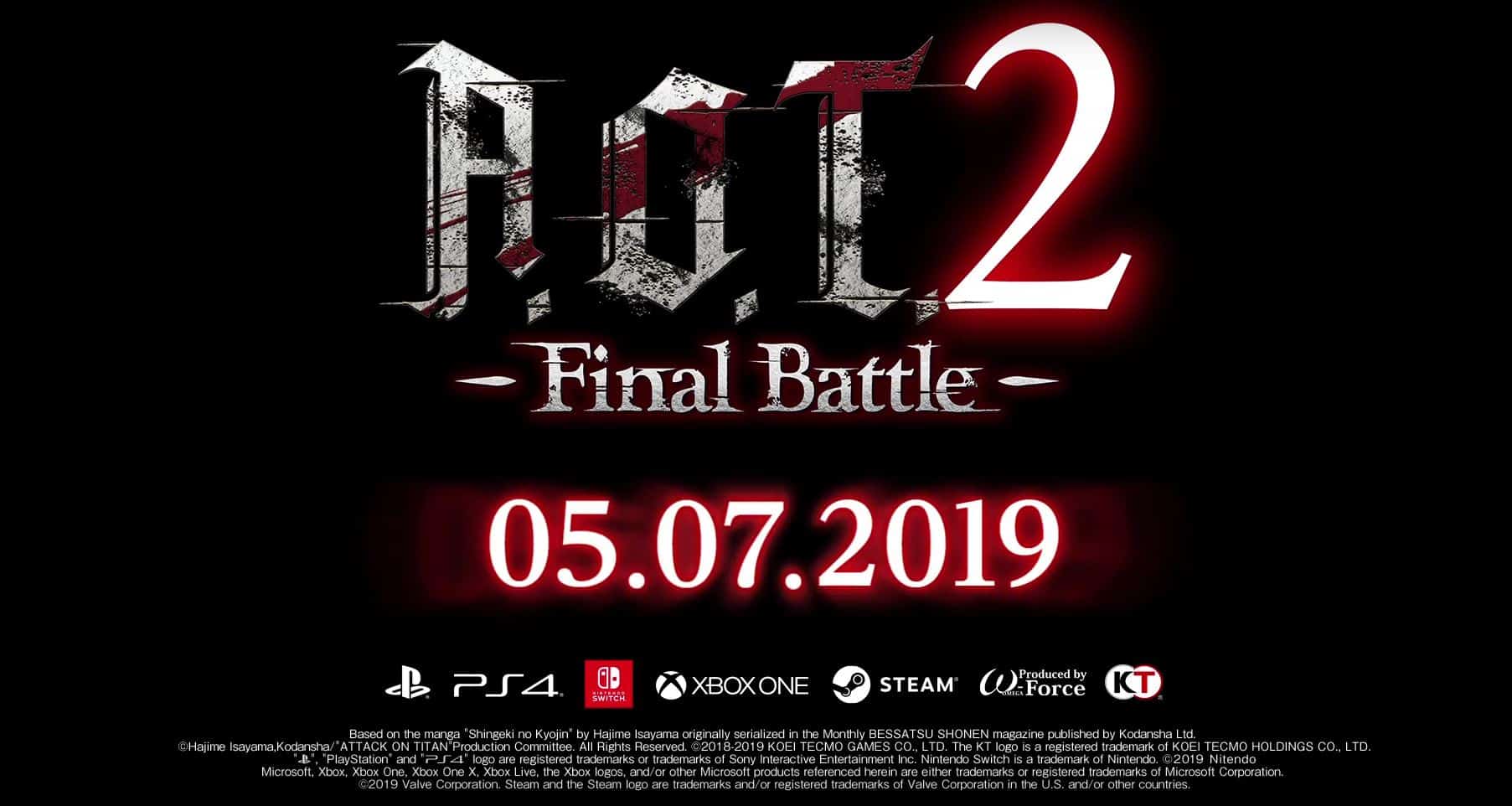 KOEI TECMO Europe veröffentlicht heute neue Informationen zum mit Spannung erwarteten Actionspiel A.O.T. 2: Final Battle. Der neueste Teil der titanischen Actionspiel-Reihe, die auf dem weltweit erfolgreichen Anime-Phänomen Attack on Titan basiert, erscheint inklusive erweiterter Kampagne und vielen neuen Features am 5. Juli 2019 für PlayStation®4, Nintendo Switch™ und der Xbox-One-Gerätefamilie, inklusive Xbox One X im Handel.