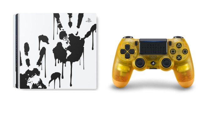 „Inspiriert von dem Spiel verfügt diese neue PS4 Pro Limited Edition über eine matte Oberfläche in Weiß mit zwei Death Stranding-Handabdrücken, deren Umrisse wie die Kontinente der Welt geformt sind. Dieses Paket, das eurem Home-Entertainment garantiert eine übernatürliche Note verleihen wird, enthält außerdem einen DUALSHOCK 4 Wireless-Controller in transparentem Orange, der dieselbe Farbe hat wie die BB-Kapsel im Spiel. Wenn ihr den Controller im Laufe des Spiels sachte schüttelt, fühlt es sich an, als würdet ihr die BB-Kapsel in euren Händen halten.“