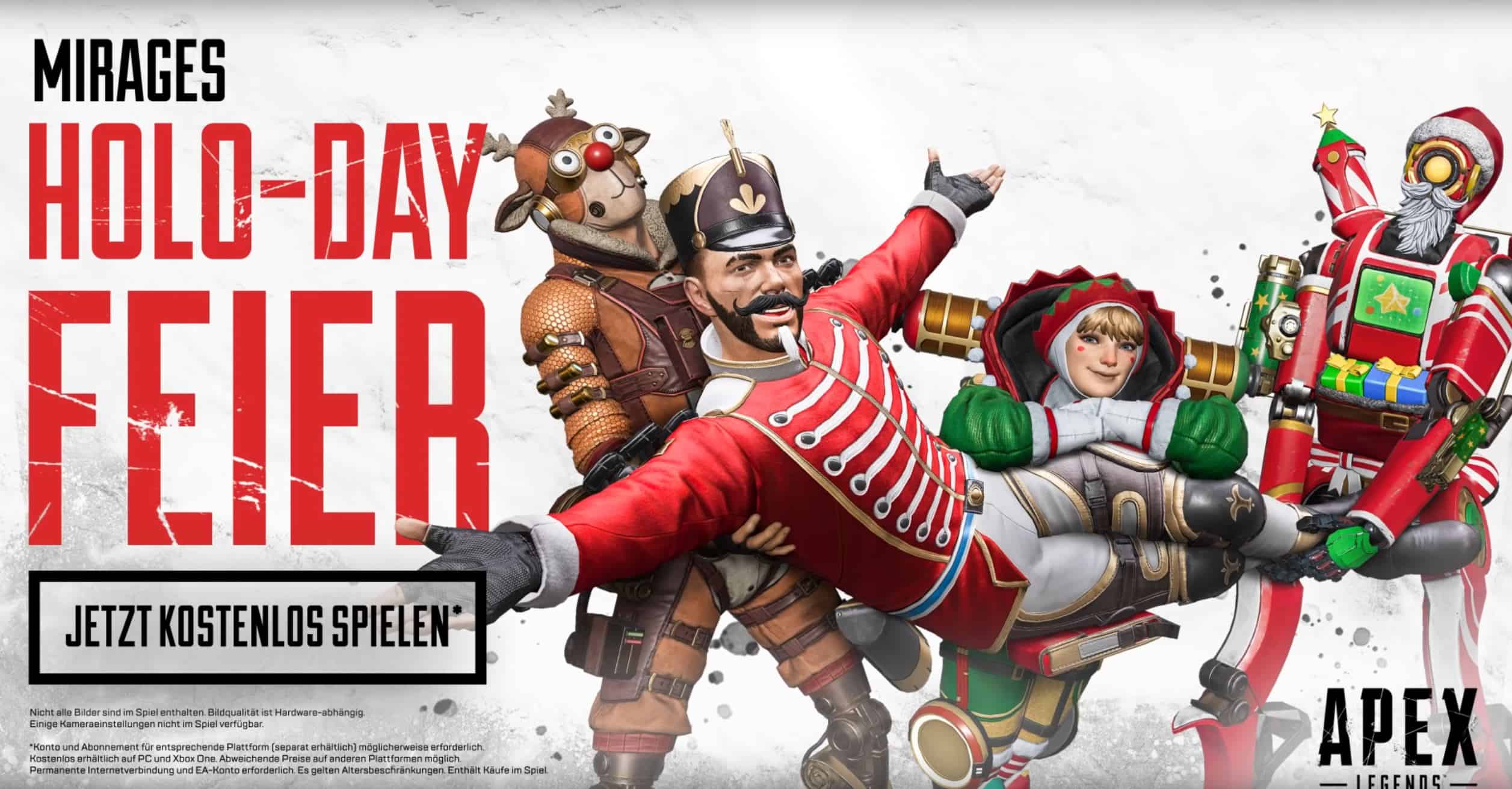 bei den diesjährigen Game Awards hat Apex Legends nicht nur den Preis als Bestes Multiplayer Game gewonnen, sondern auch ein neues Event angekündigt, das kein Geringerer als der verwegene Duplikator Mirage selbst vorstellte. Mit Mirages Holo-Day-Feier kehrt festliche Stimmung in Apex Legends ein, während das zeitlich begrenzte Event zwischen dem 12. Dezember und 7. Januar stattfindet.