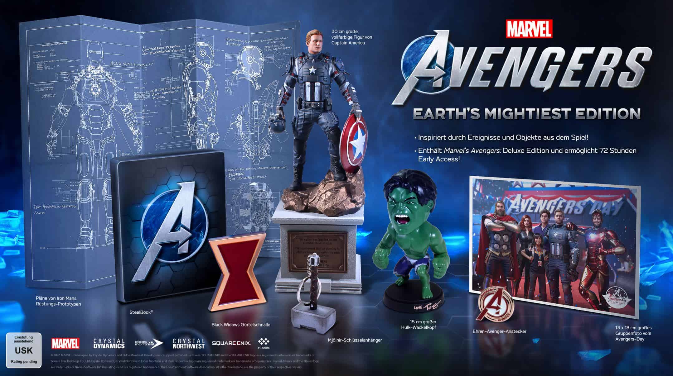 MARVEL’S AVENGERS: Earth’s Mightiest Edition umfasst eine 30 cm große Figur von Captain America. Diese hochwertige Luxusfigur aus PVC wurde von den Künstlern bei Gentle Giant entworfen und bildet sämtliche Details von Captain Americas Uniform ab. MARVEL’S AVENGERS: Earth’s Mightiest Edition enthält ferner ein Exemplar der Deluxe Edition, ein exklusives SteelBook, einen Hulk-Wackelkopf, einen Mjölnir-Schlüsselanhänger, Black Widows Gürtelschnalle, Pläne für Iron Mans Rüstungs-Prototypen, Kamala Khans Ehren-Avenger-Anstecknadel, ein Avengers-Erinnerungsfoto sowie 72 Stunden Early Access vor der Veröffentlichung des Spiels am 4. September 2020.