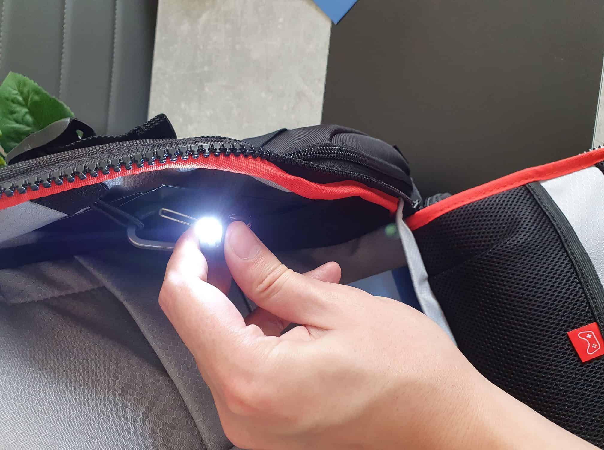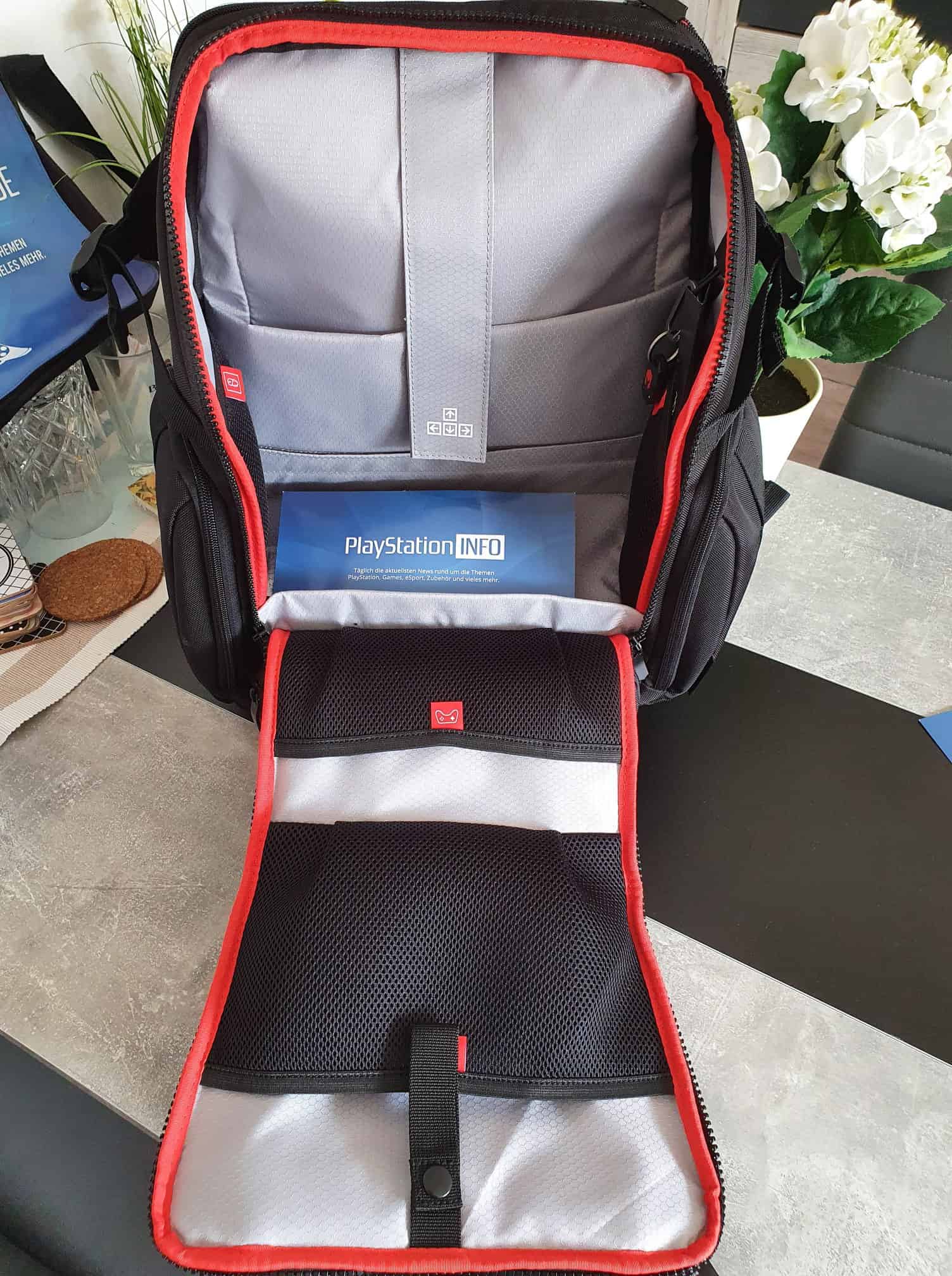 Ein zentraler Reißverschluss in der Mitte öffnet oder schließt das Backpack. Einmal geöffnet werden gleich mehrere Aufbewahrungsorte sichtbar. Diese sind sogar entsprechend gekennzeichnet. Zum Beispiel in dieses Fach gehört die Maus, in dieses Fach kommt der Controller und in dieses die Kabel. Einfacher geht es nicht und hier sieht man gleich, was ich zu Anfangs schon meinte. Das ganze Konzept ist bis ins kleinste Detail durchdacht.