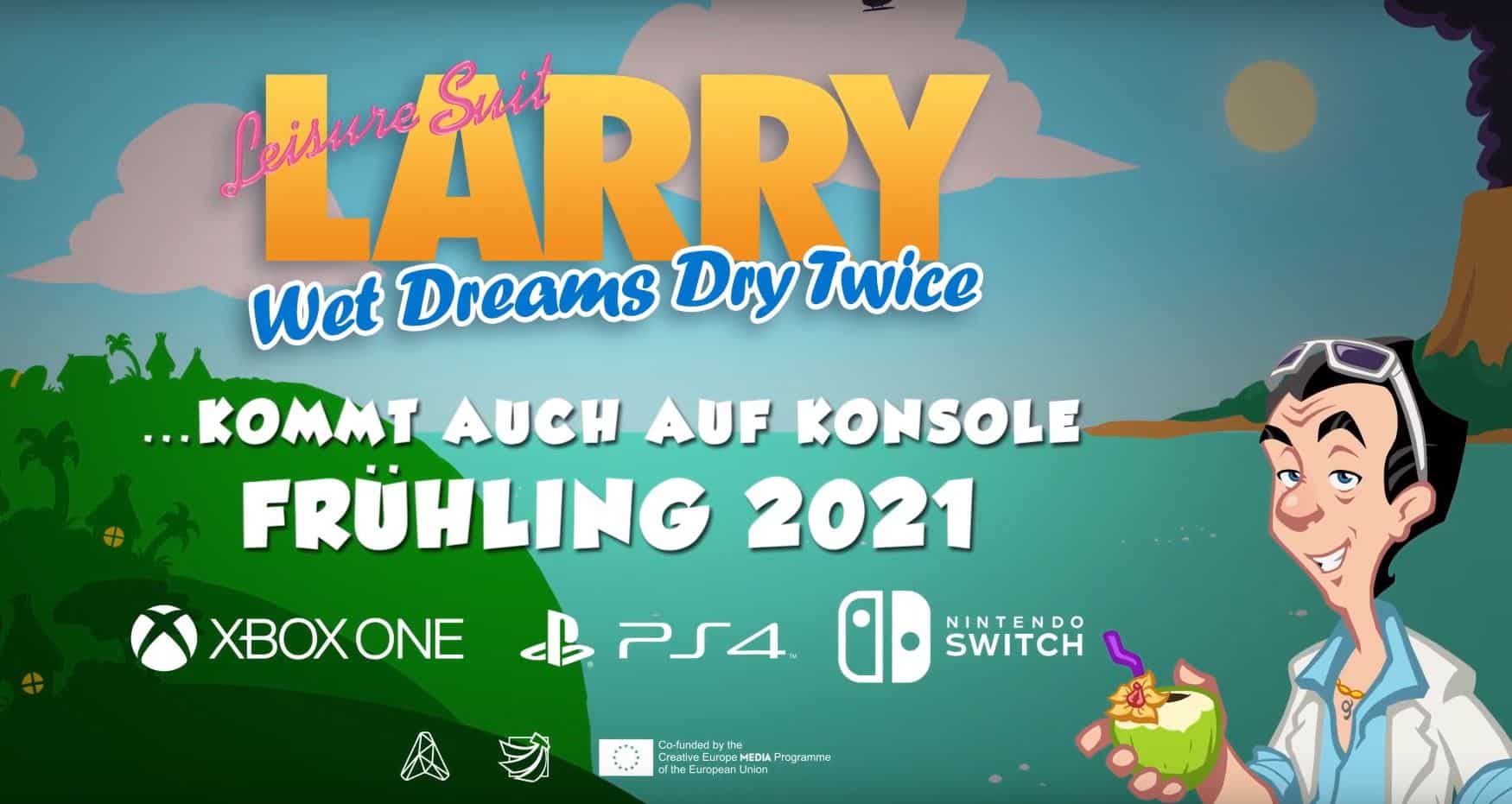 Publisher Assemble Entertainment und Entwickler CrazyBunch veröffentlichen das beliebte Point & Click-Abenteuer Leisure Suit Larry – Wet Dreams Dry Twice im Frühling 2021 für PlayStation 4, Xbox One und Nintendo Switch. Die Versionen für PlayStation 4 und Nintendo Switch erscheinen im Handel.