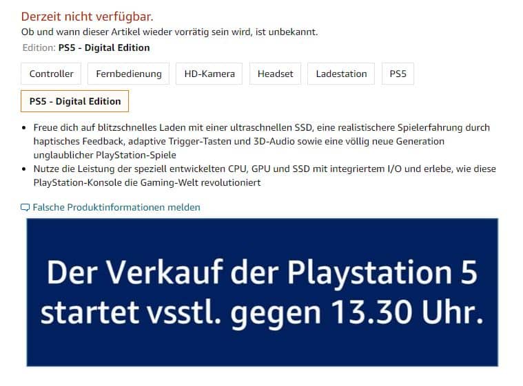 Amazon hat eben mitgeteilt, das der Verkauf der kommenden PS5 Konsole um ca. 13.30 starten wird.