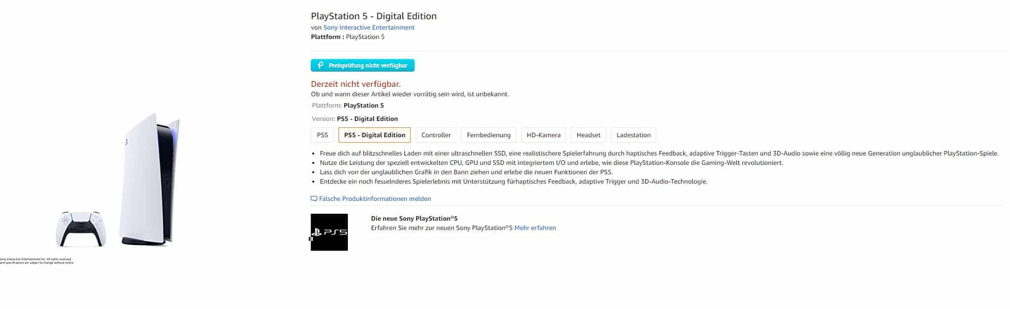 Die PlayStation 5 Konsole ist gerade wieder auf Amazon verfügbar. Ab sofort könnt ihr wieder bei Amazon die PlayStation5 Konsole bestellen. Hier der Link zum Amazon Angebot.