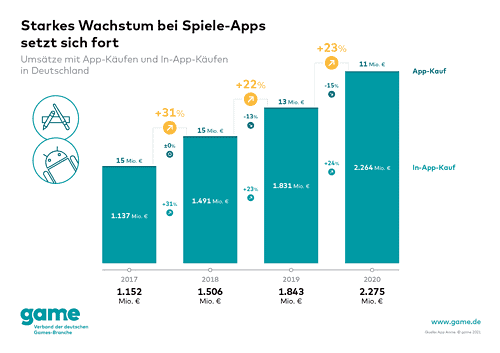 Ob eine schnelle Runde bei einem Puzzlespiel, ein interaktives Quiz gegen Mitspielende aus aller Welt oder sogar strategische Team-Spiele in einem Ligasystem: Spiele-Apps begeistern immer mehr Menschen. Die einfache Verfügbarkeit und die wachsende Vielfalt an Titeln lassen die Anzahl der Spielenden stetig steigen und auch der Umsatz wächst Jahr für Jahr deutlich. 2020 konnte der Markt für Spiele-Apps abermals kräftig zulegen: Innerhalb eines Jahres stieg der Umsatz mit Games für Smartphones und Tablets in Deutschland um 23 Prozent auf rund 2,3 Milliarden Euro.