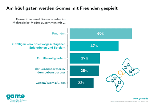 Auch in Familien nehmen Games längst einen festen Platz ein: So spielen rund 4,8 Millionen der Multiplayer-Spielenden in Deutschland gemeinsam mit Familienmitgliedern – das ist knapp jeder Dritte (29 Prozent). Häufiger wird nur mit Freunden (60 Prozent) oder zufällig vom Game zugewiesenen Mitspielenden (47 Prozent) gespielt. In Gilden, festen Teams und Clans spielt knapp ein Viertel der Befragten (23 Prozent).