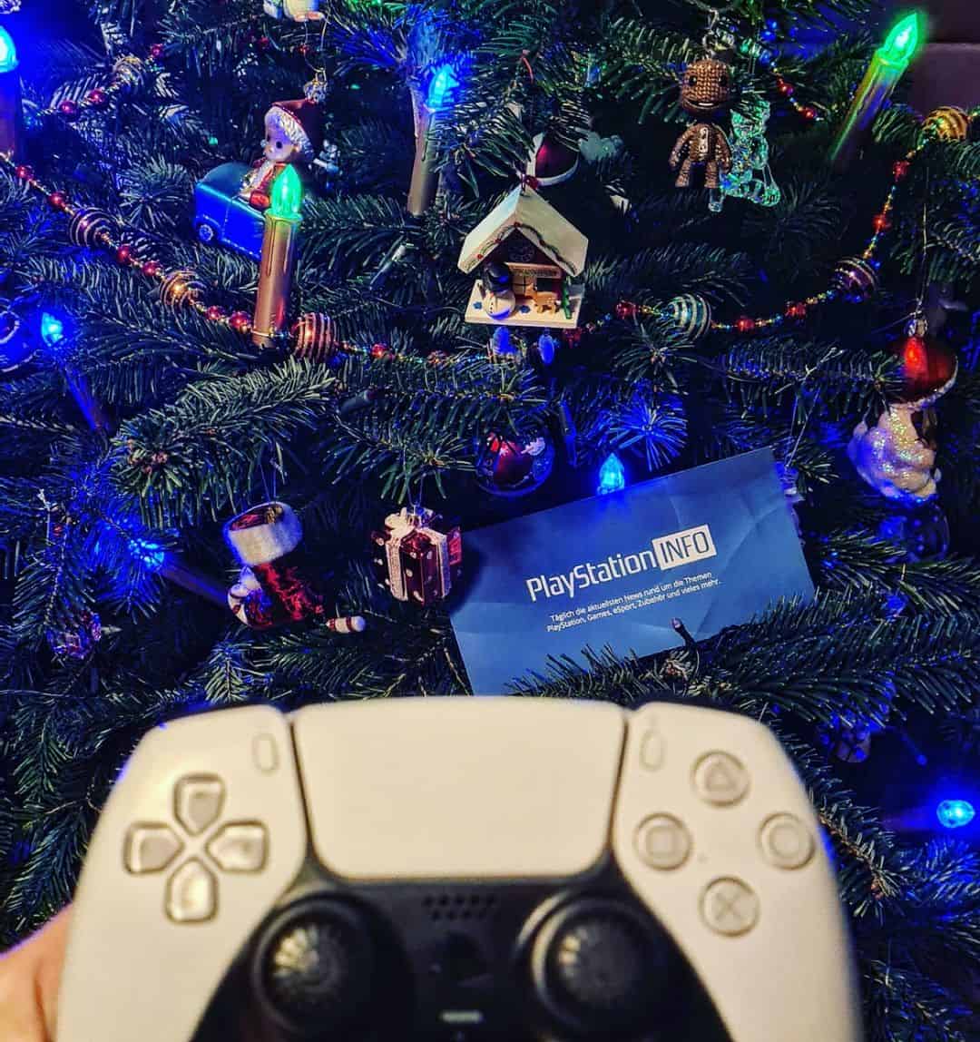 Der Weihnachtsbaum sorgt für Gemütlichkeit, die vier Controller für die Helligkeit. Die verpackte PlayStation 4 oder auch die PlayStation 5 Konsolen bringen die Fröhlichkeit, die PS VR die virtuelle Wirklichkeit.