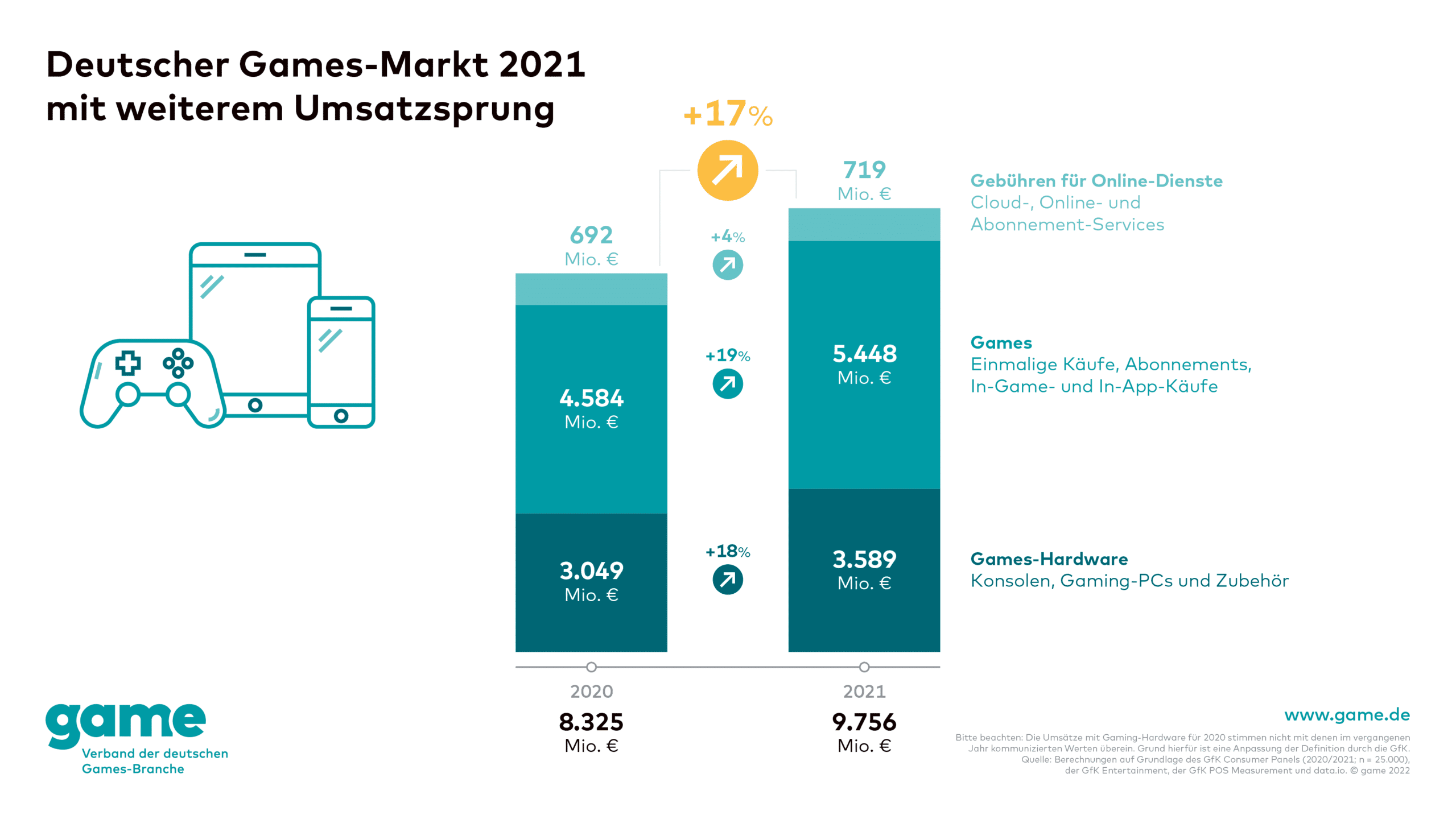 Der deutsche Games-Markt konnte nach dem historischen Wachstumssprung 2020 auch im Folgejahr deutlich zulegen: So wurden 2021 mit Games, Gebühren für Online-Dienste sowie Games-Hardware rund 9,8 Milliarden Euro umgesetzt.