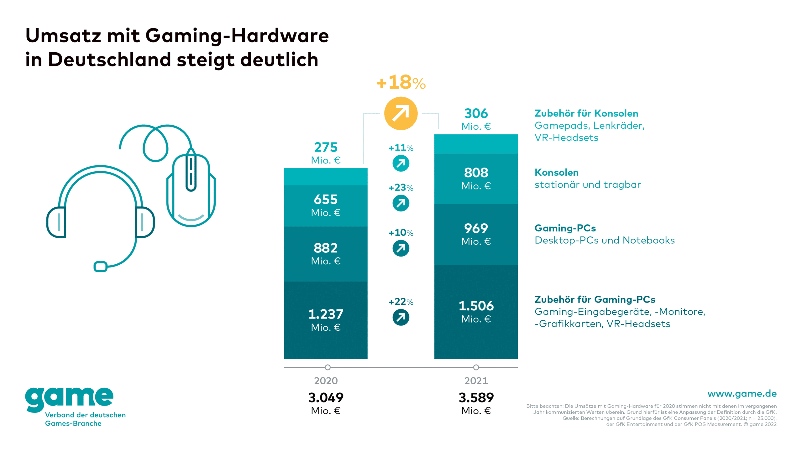 • Umsatz mit Games und Games-Hardware ist 2021 in Deutschland um 17 Prozent auf rund 9,8 Milliarden Euro gestiegen