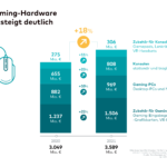 Der Umsatz mit Gaming-Hardware ist insgesamt um 18 Prozent auf rund 3,6 Milliarden Euro gestiegen. Besonders stark nachgefragt sind Spielekonsolen: Obwohl manche Modelle im Handel häufig vergriffen waren, stieg der Umsatz dennoch um 23 Prozent auf 808 Millionen Euro. Rund 1 Milliarde Euro wurde mit Spiele-PCs – Desktops und Laptops – umgesetzt. Das ist ein Plus von 10 Prozent im Vergleich zum Vorjahr. Immer mehr Spielerinnen und Spieler investieren zudem in Zubehör, mit dem sich das Spielerlebnis weiter verbessern lässt. Besonders stark nachgefragt sind Grafikkarten, Tastaturen und Mäuse sowie Monitore und VR-Headsets für den Gaming-Einsatz. Der Umsatz mit Gaming-PC-Zubehör stieg um 22 Prozent auf rund 1,5 Milliarden Euro. Um 11 Prozent auf 306 Millionen Euro legte der Umsatz mit Zubehör für Spielekonsolen zu.