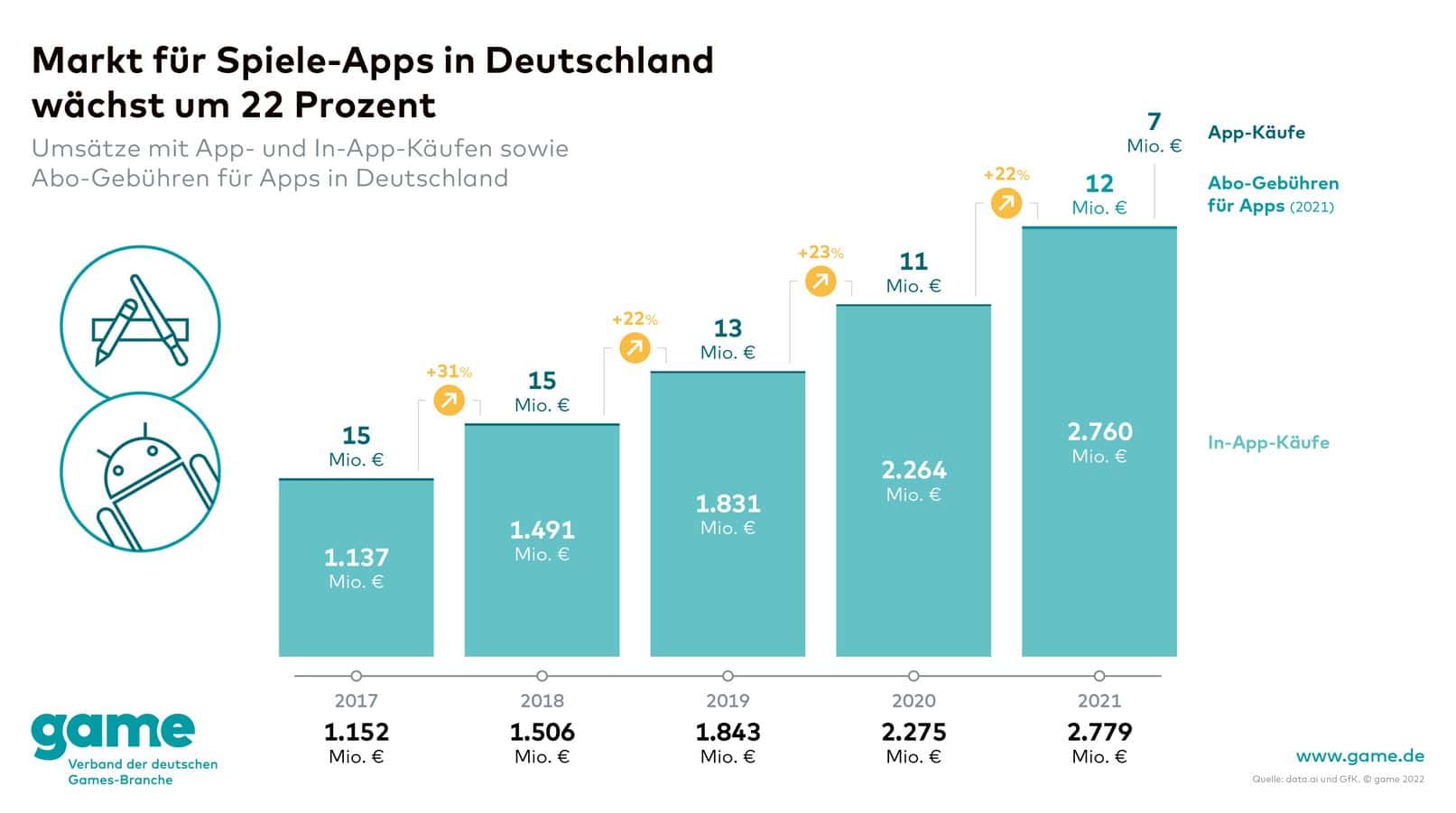 Auch im Jahr 2021 verzeichnet der deutsche Markt für Mobile Games ein deutliches Wachstum von 22 Prozent: Der Umsatz mit Spiele-Apps stieg auf rund 2,8 Milliarden Euro. Dieses Wachstum setzt den beeindruckenden Trend aus den Vorjahren fort: Bereits 2020 stieg der Umsatz um 23 Prozent. Das gab heute der game – Verband der deutschen Games-Branche auf Basis von Daten der Marktforschungsunternehmen data.ai und GfK bekannt.
