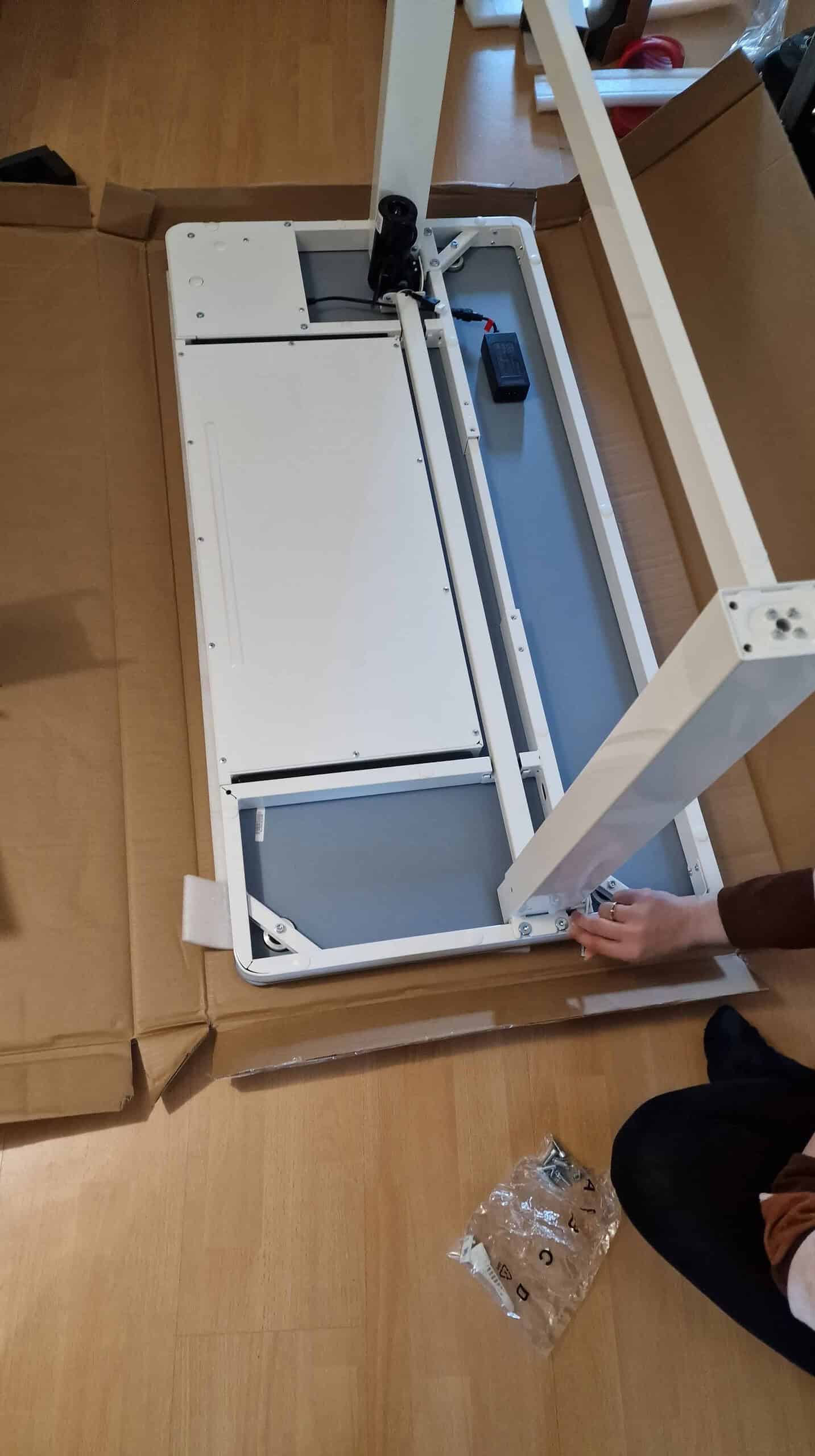 Mein Schreibtisch kam in zwei gut verpacken großen Pakten. Also die Tischplatte und der Fuß wurden separat verschickt. Meine Frau liebt es, Sachen zusammen zubauen und ja sie sollte ihn dann aufbauen. Sie war schon nach 10 Minuten fertig. Denn dieser Schreibtisch ist in 3 schnellen Schritten schon fertig zusammengebaut.
