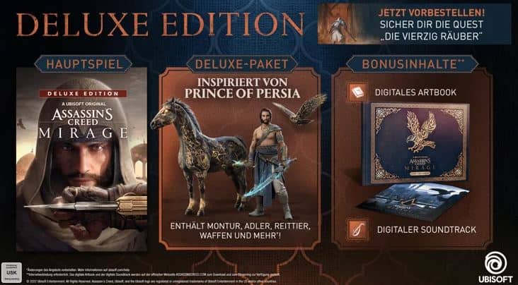 Die Deluxe Edition enthält das Grundspiel, ein digitales Artbook und einen Soundtrack, sowie ein Deluxe-Paket, das ein von Prince of Persia inspiriertes Outfit, Adler- und Reittier-Skins, Waffen und mehr enthält!