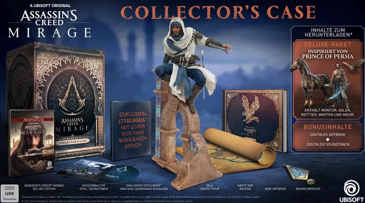 Das Collector’s Case enthält die Deluxe Edition mit einer hochwertigen Figur von Basim (32cm), ein exklusives SteelBook mit einem von den Fans zu wählenden Design, ein Mini-Artbook, eine Nachbildung von Basims Brosche, eine Karte von Bagdad sowie einen Selected Soundtrack des Spiels. Das Collector’s Case ist im Ubisoft Store und bei ausgewählten Händlern erhältlich.