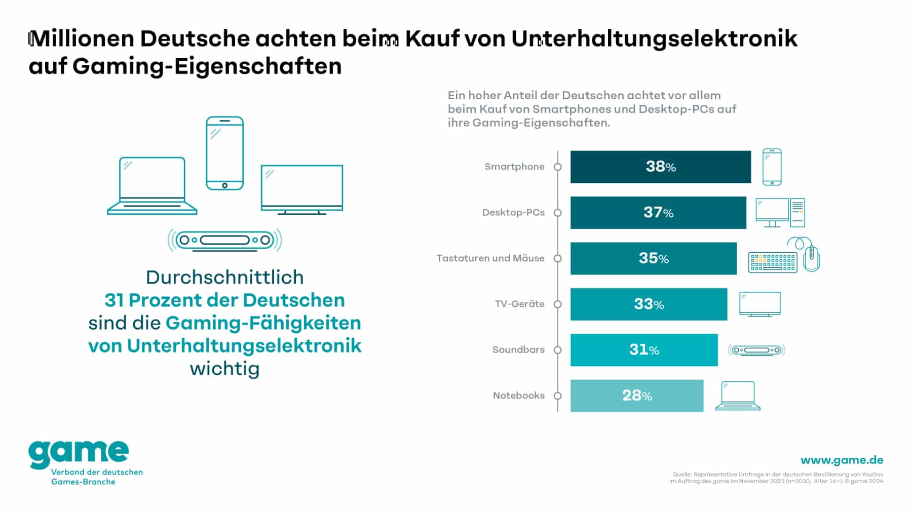 Der Fernseher mit spezieller Bildschirmtechnologie für beste Darstellung, die Maus oder Tastatur mit besonders geringer Reaktionszeit oder das Smartphone mit Hochleistungsprozessor: Unterhaltungselektronik verfügt immer häufiger über technische Eigenschaften, die speziell auf das Gaming ausgerichtet sind. Laut einer Umfrage des game – Verband der deutschen Games-Branche in Zusammenarbeit mit YouGov, achten im Durchschnitt rund 31 Prozent der Deutschen beim Kauf von Smartphones, Fernsehern und Co. darauf, dass die Geräte besonders für das Spielen optimiert wurden.