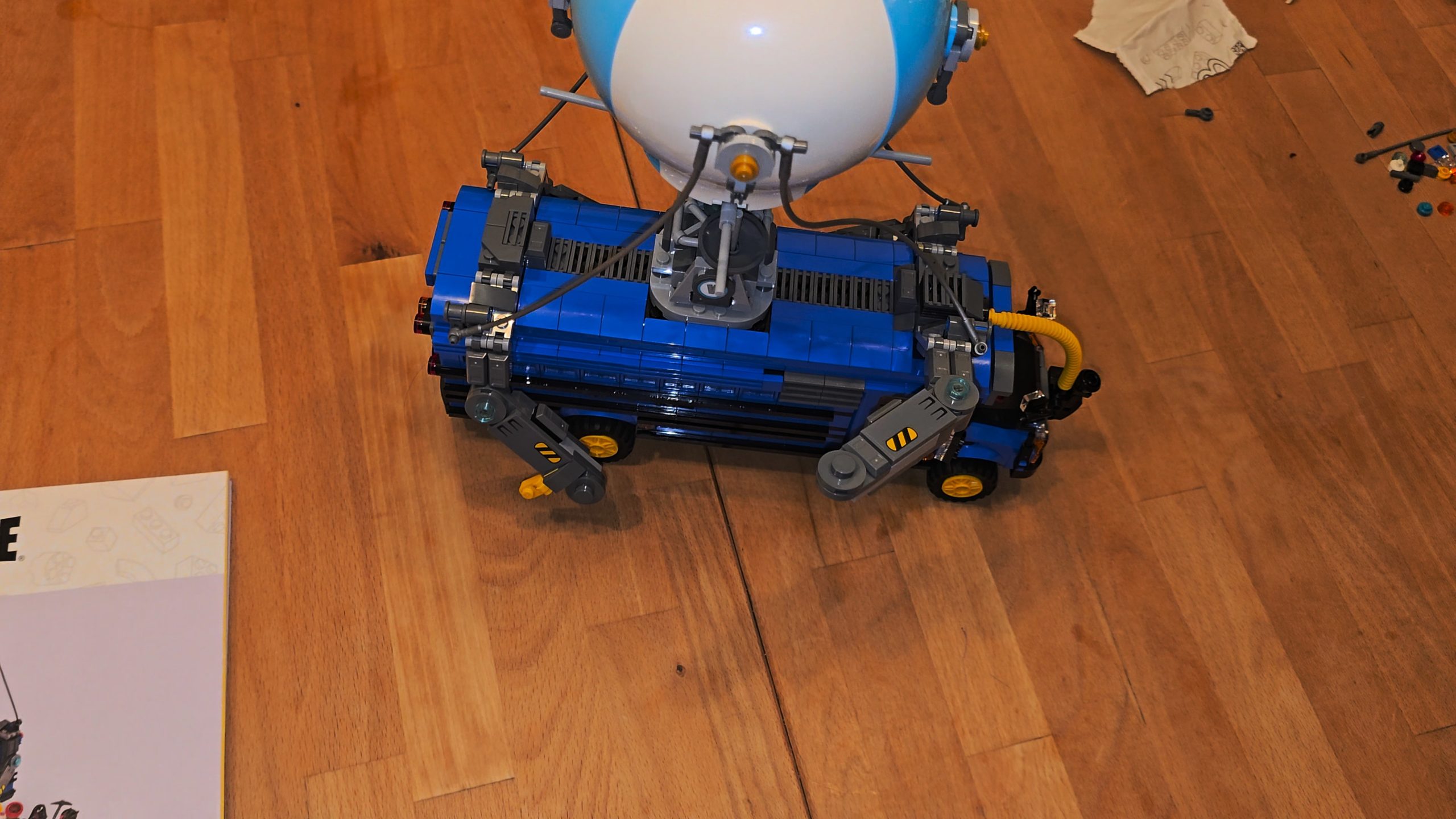 Einer der größten Pluspunkte des LEGO Battle Bus ist das authentische Design. Der Schlachtbus sieht dem In-Game-Vorbild wirklich sehr ähnlich. Die Details wie die Luftballons am Bus, die für den ikonischen Absprungpunkt stehen, und die kleinen Verzierungen machen den Battle Bus zu einem echten Hingucker. Auch die Farbwahl passt gut zur Fortnite-Optik – mit dem leuchtenden Blau und den klassischen Fortnite-Farben zieht der Bus sofort die Aufmerksamkeit auf sich.