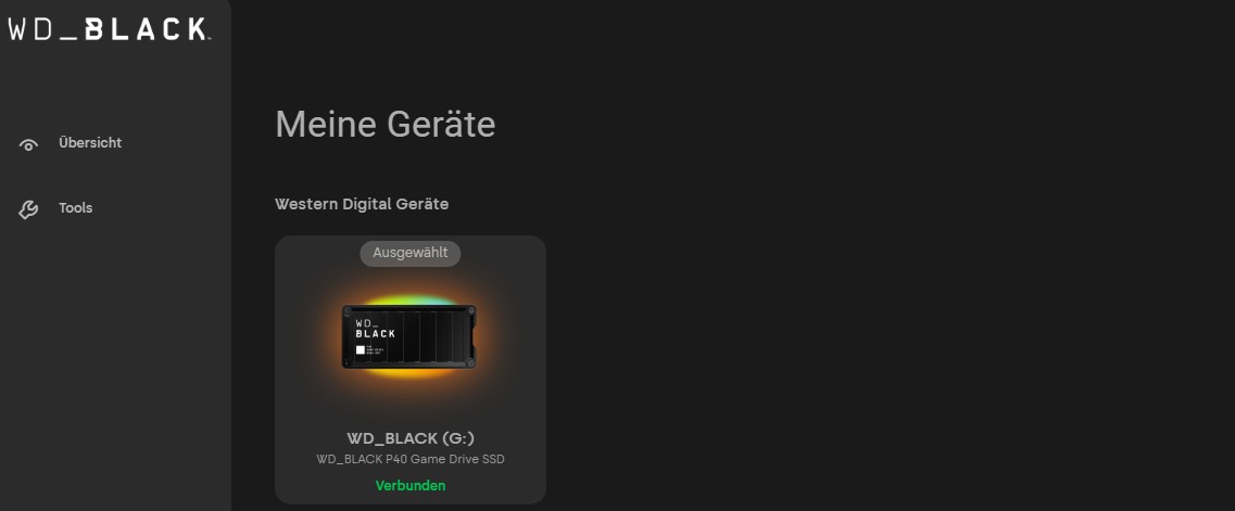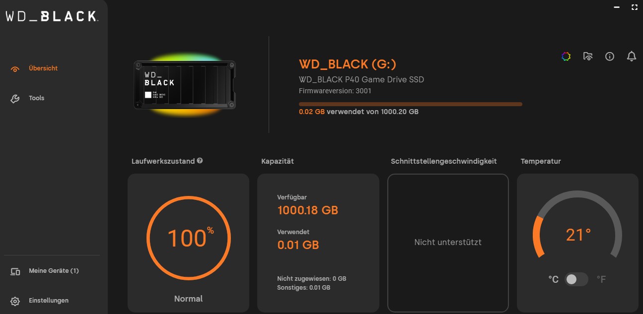 - WD_BLACK Dashboard: Mit dieser Software kannst Du nicht nur die RGB-Beleuchtung anpassen, sondern auch wichtige Informationen über den Zustand der SSD abrufen, wie z. B. verfügbare Speicherkapazität oder Leistungsauslastung.