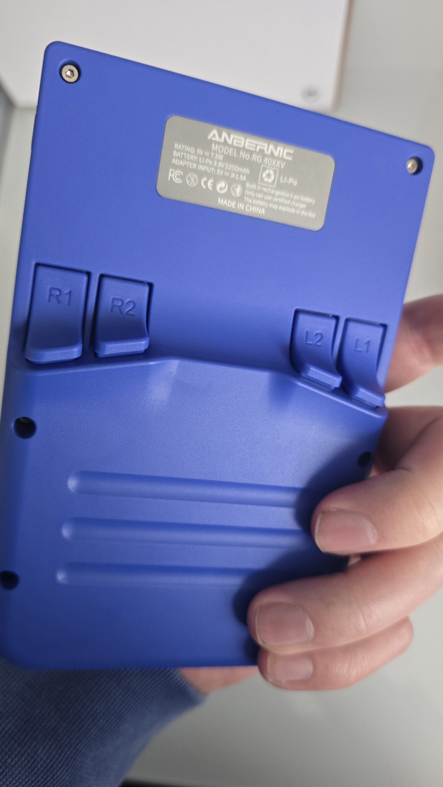 Der Anbernic RG40XX V orientiert sich stark an klassischen Designs der 90er und erinnert optisch an den legendären Game Boy Pocket – nur moderner. Mit einer Größe von ca. 14 x 8 cm liegt er angenehm in der Hand und ist weder zu schwer noch zu leicht.