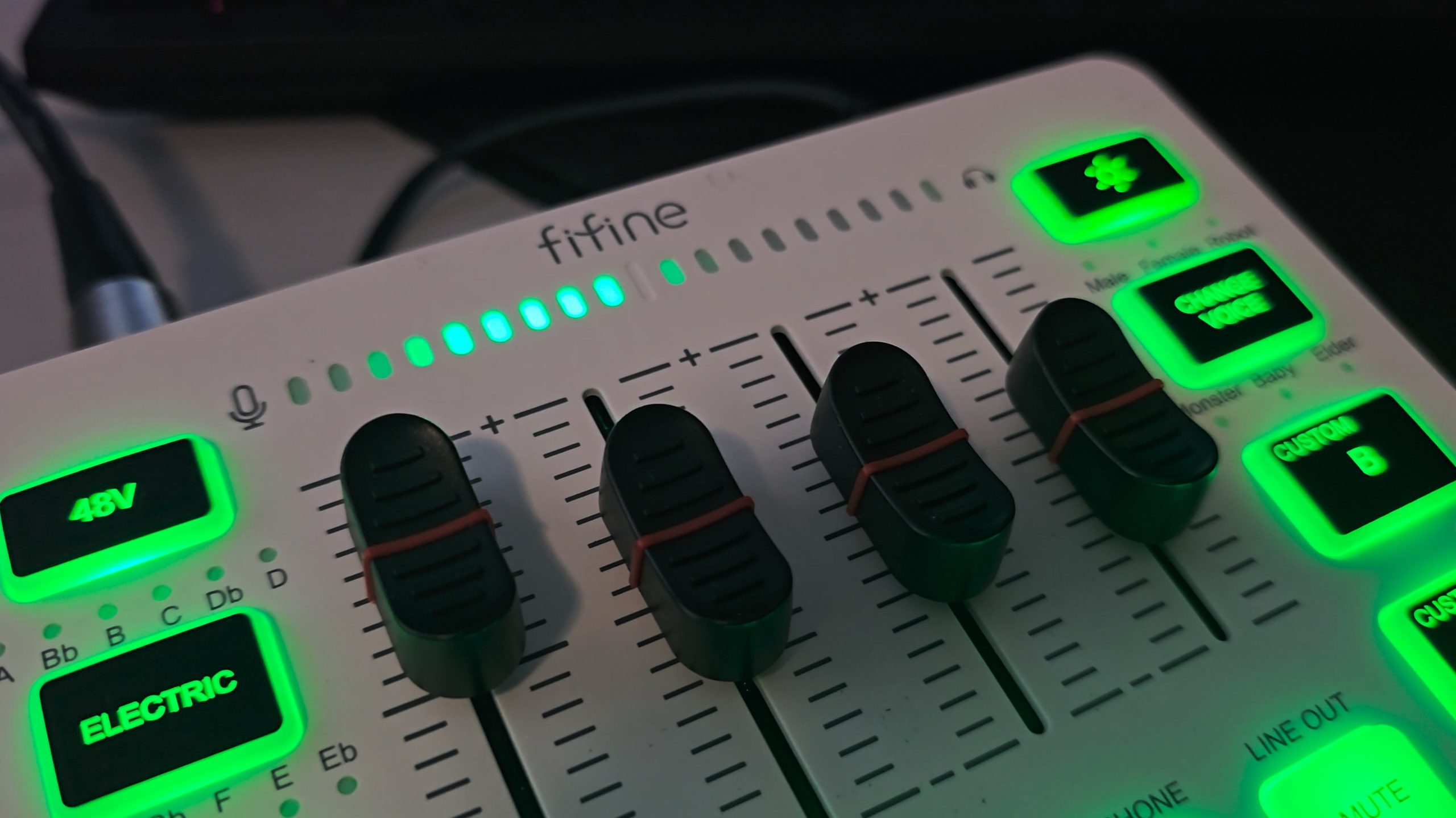 - Die Lautstärkeregler (Fader) ermöglichen gutes Feintuning: Man kann Mikro, Spielsound, Musik usw. sauber trennen und in der Lautstärke anpassen.