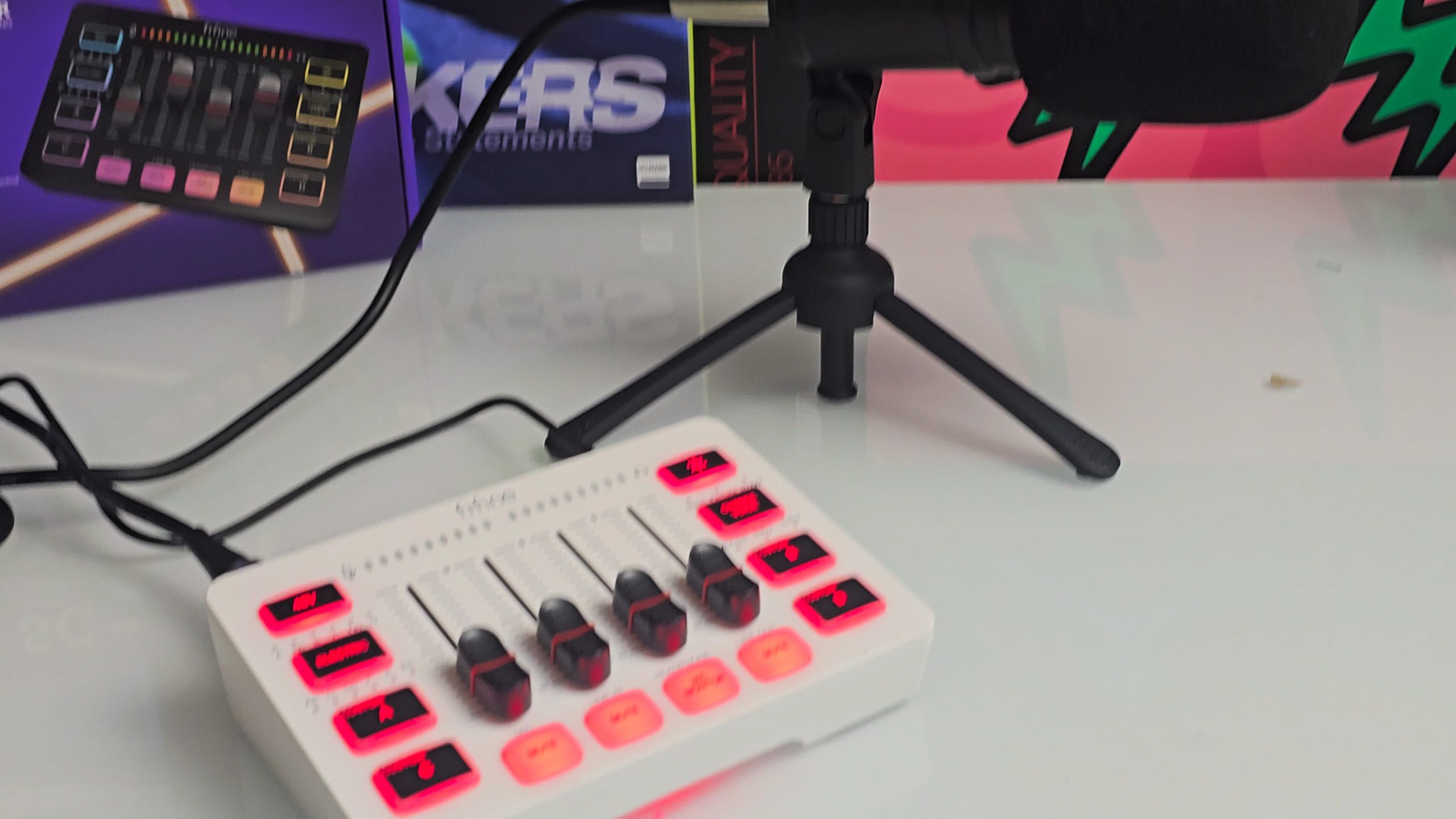 - Vier Sound-Pads / programmierbare Tasten: Man kann eigene Soundeffekte aufnehmen und abrufen – ideal für Streams, für kleine Gags oder um Atmosphäre zu schaffen.