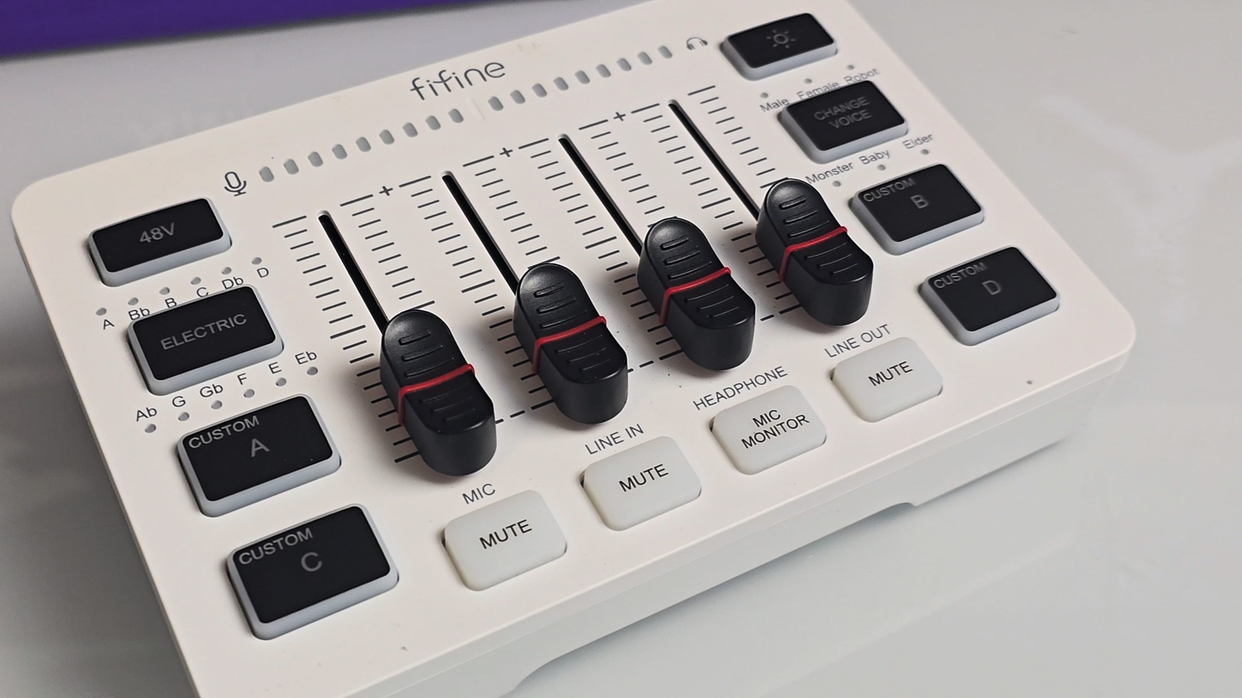 - Insgesamt 4 Kanäle/Sliders: Mikrofon-Eingang, Line-In, Kopfhörer-Monitor und Line-Out. Jeder Kanal lässt sich individuell regeln.