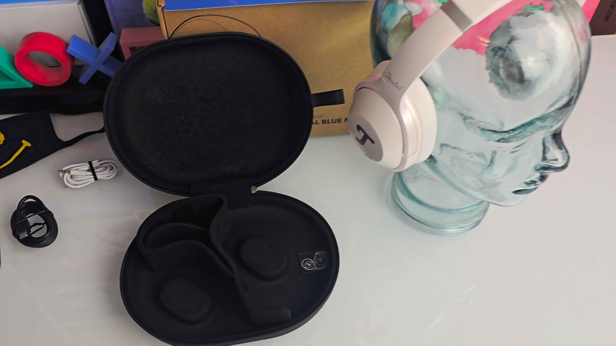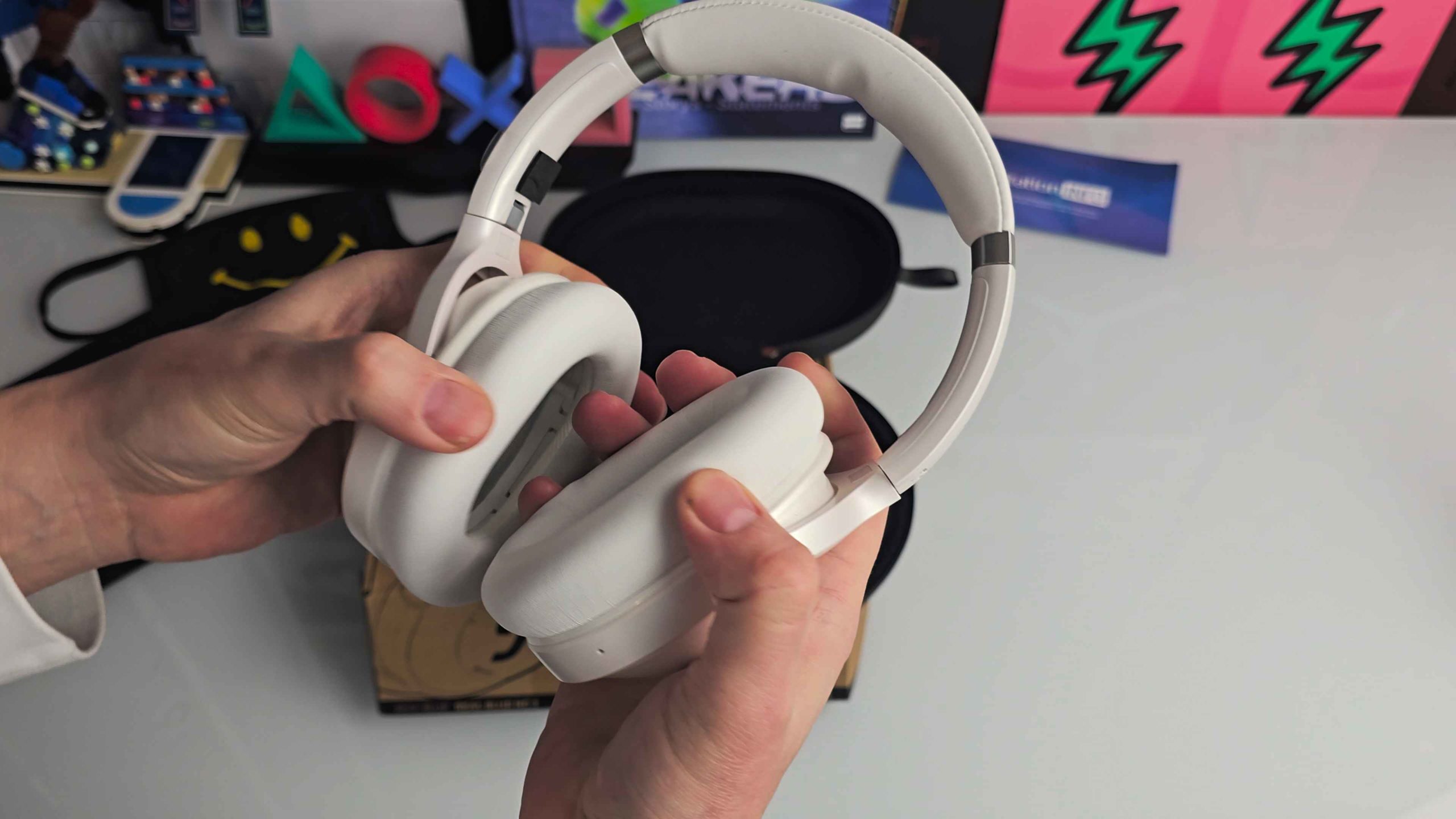Schon beim Auspacken macht der REAL BLUE NC 3 einen sehr hochwertigen Eindruck. Die matte Oberfläche in Pearl White wirkt elegant und unaufdringlich, Fingerabdrücke sind kaum sichtbar. Die Verarbeitung ist tadellos: nichts knarzt, nichts wirkt billig. Die Gelenke sind stabil, die Ohrmuscheln lassen sich sauber drehen und einklappen – ideal für den Transport.