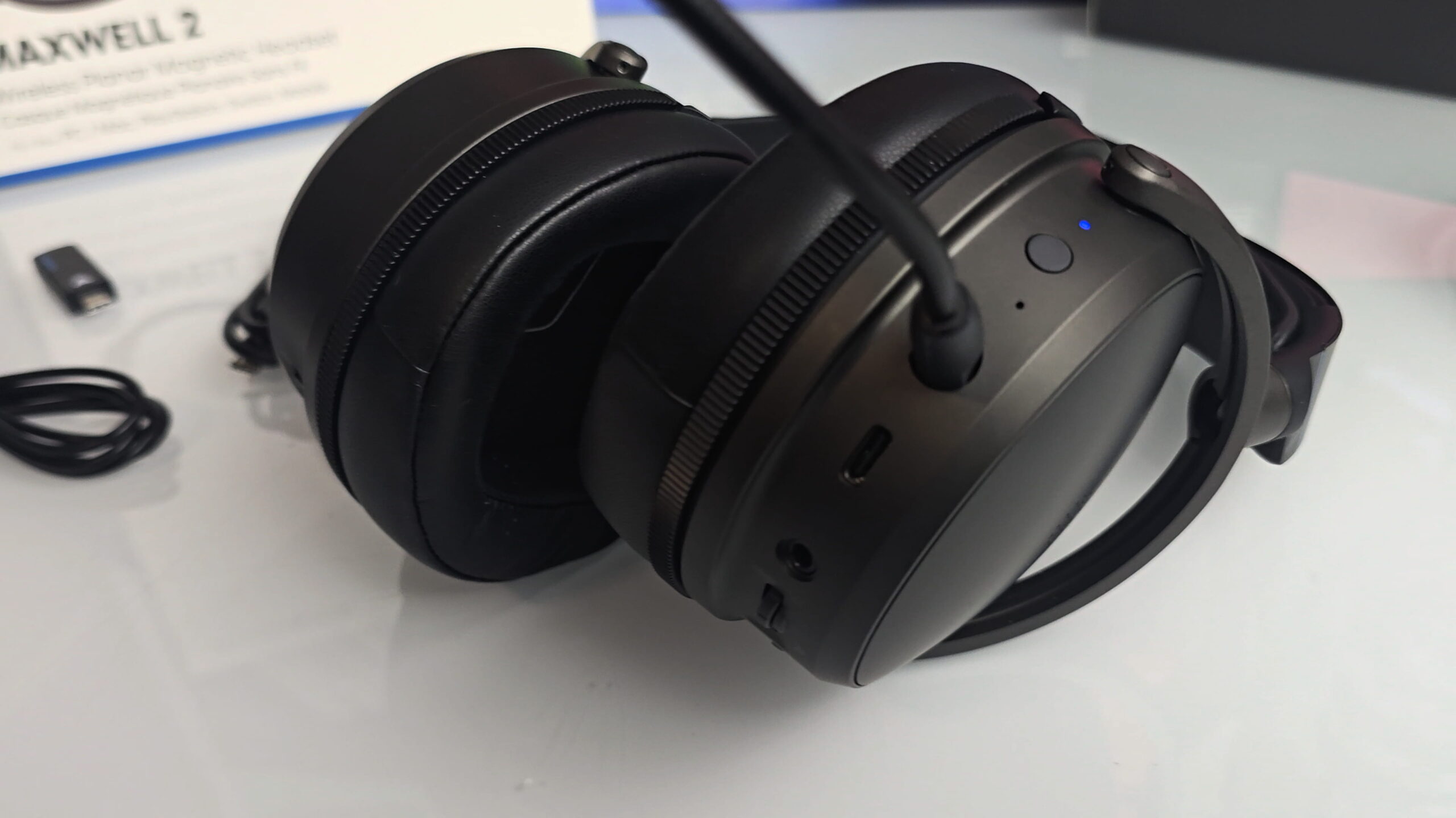 Der Lieferumfang des Audeze Maxwell 2 fällt erfreulich umfangreich und hochwertig aus. Neben dem Headset selbst liegen ein abnehmbares Mikrofon, ein USB-C-Dongle für die kabellose Low-Latency-Verbindung (ideal für PS5), ein USB-C-Ladekabel sowie ein 3,5-mm-Klinkenkabel für den kabelgebundenen Betrieb bei.
