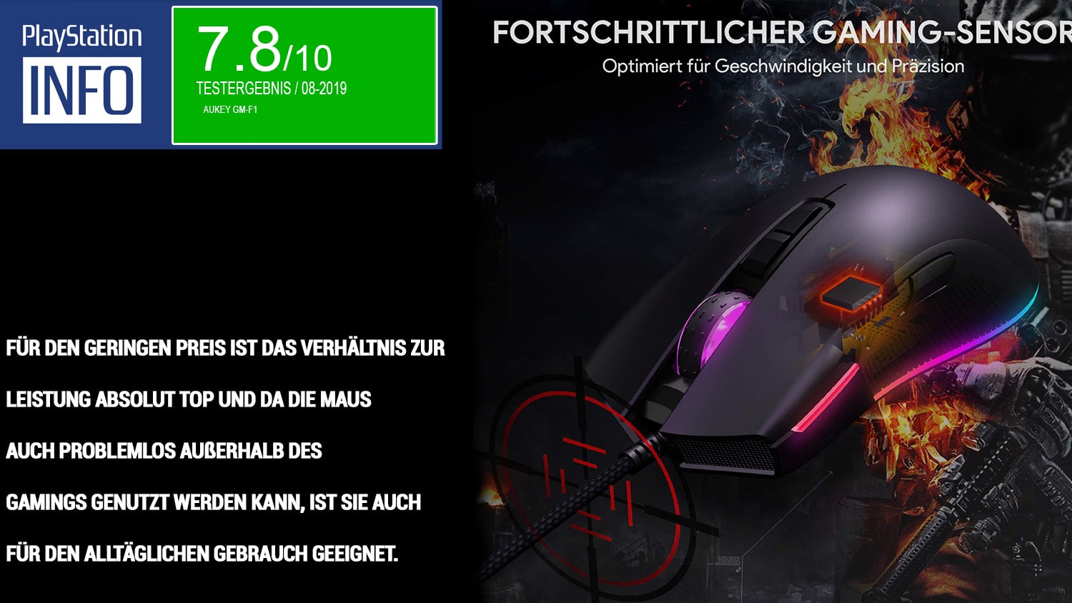 Der ein oder andere wundert sich jetzt sicherlich. Ja, eine PlayStation-fokussierte Seite hat eine Gaming-Maus für den PC getestet. Verratet es bitte nicht, aber gelegentlich spielen wir auch am PC, sodass ein entsprechender Test problemlos möglich ist. Aukey ist übrigens ein asiatischer Anbieter, der vor allem Amazon nutzt, um seine Produkte auch außerhalb des Kontinents anzubieten. Derzeit vertreibt man ebenfalls in Europa sowie Nordamerika und wie vor allem die Bewertungen beim besagten Onlinehändler zeigen mit großer Zufriedenheit der Kunden. Kommen wir aber zu den harten Fakten. Kann die Aukey GM-F1 überzeugen?