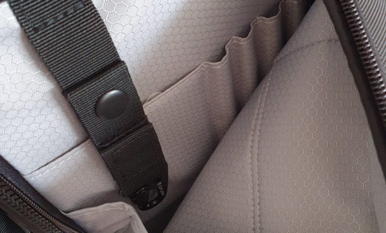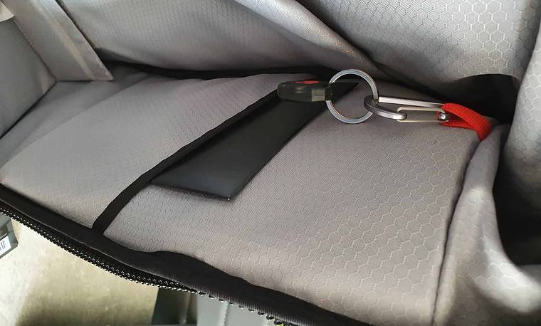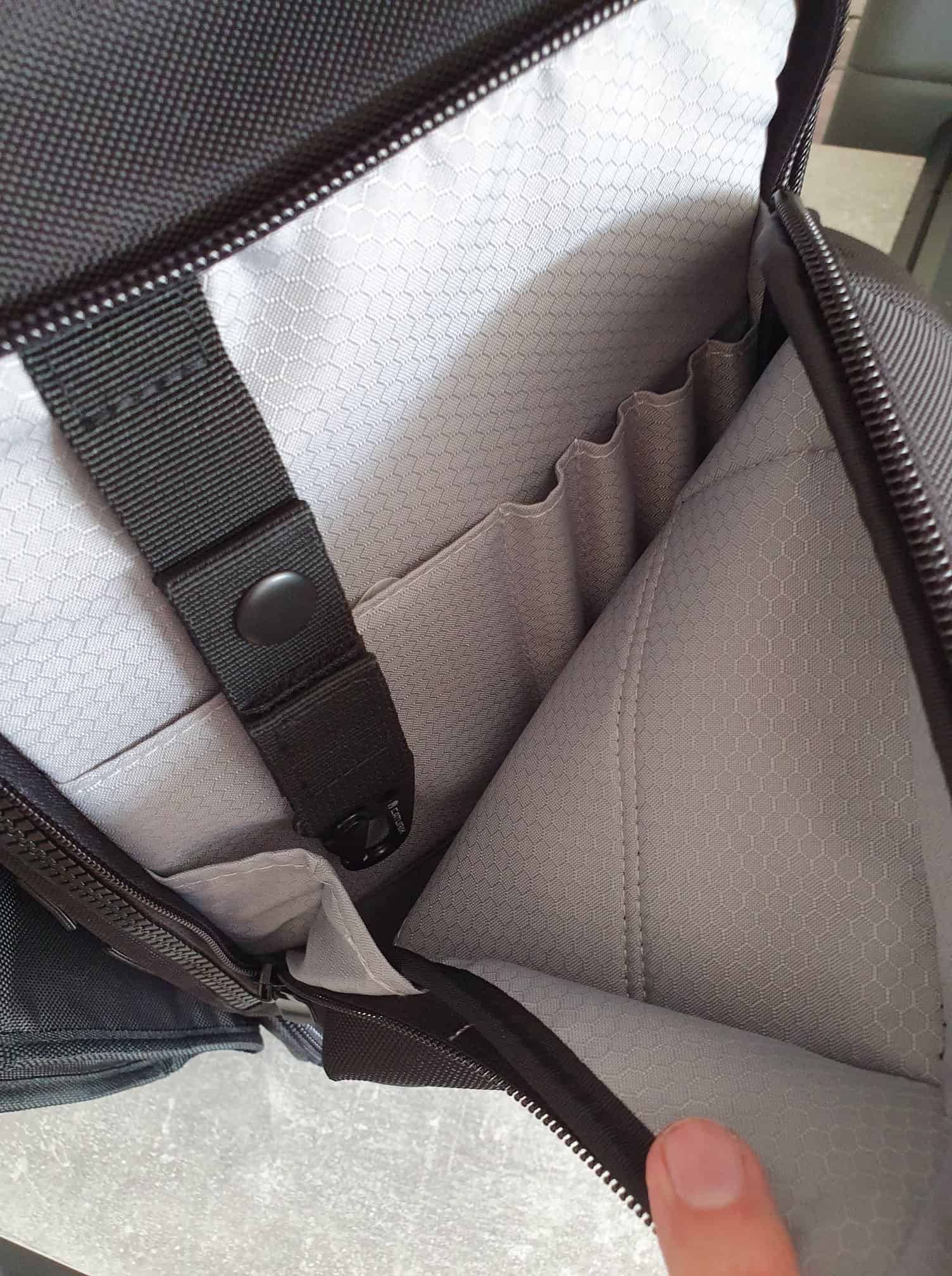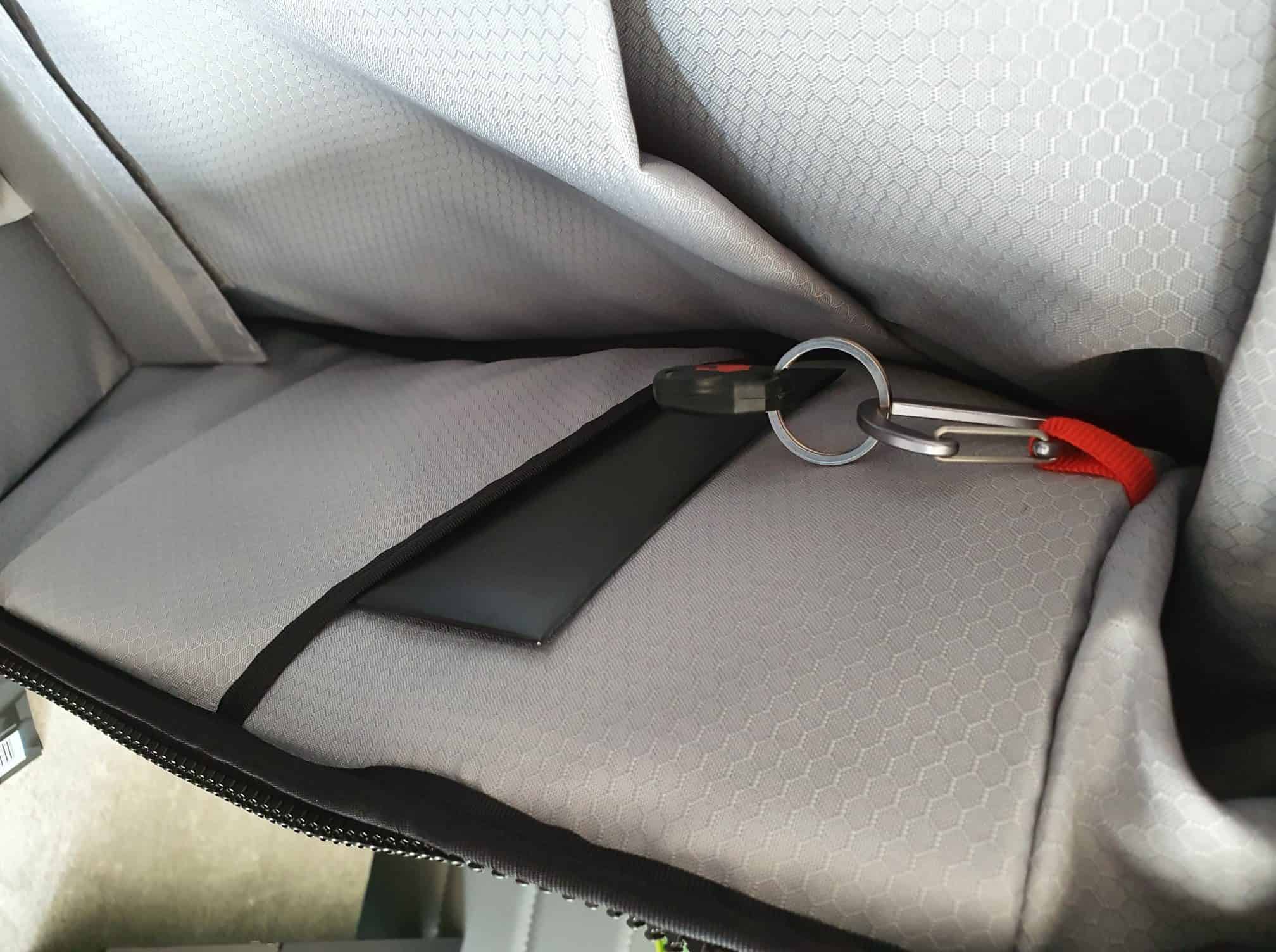 Links und Recht befinden sich wieder 2 weitere Fächer. Das eine ist wie gehabt ein Regenschutz und das andere Fach eine Workstation. Dort könnt ihr Sachen ablegen wie Stifte etc.