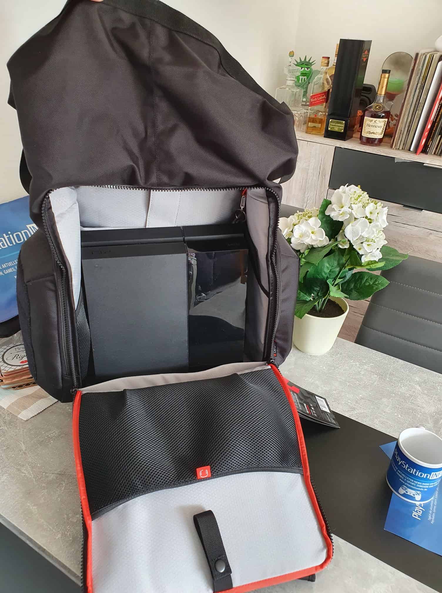 Wir haben ein sehr großes gepolstertes Fach in der Mitte. Des weiteren an der Seite die erwähnte Taschenlampe. Dazu kommt ein Fach für das Headset. Praktisch ist auch an der Stelle wieder, alle Fächer sind gekennzeichnet, sodass ihr perfekt wisst, wo was hin gehört bzw. kann – ihr könnt das natürlich handhaben wie ihr wollt.