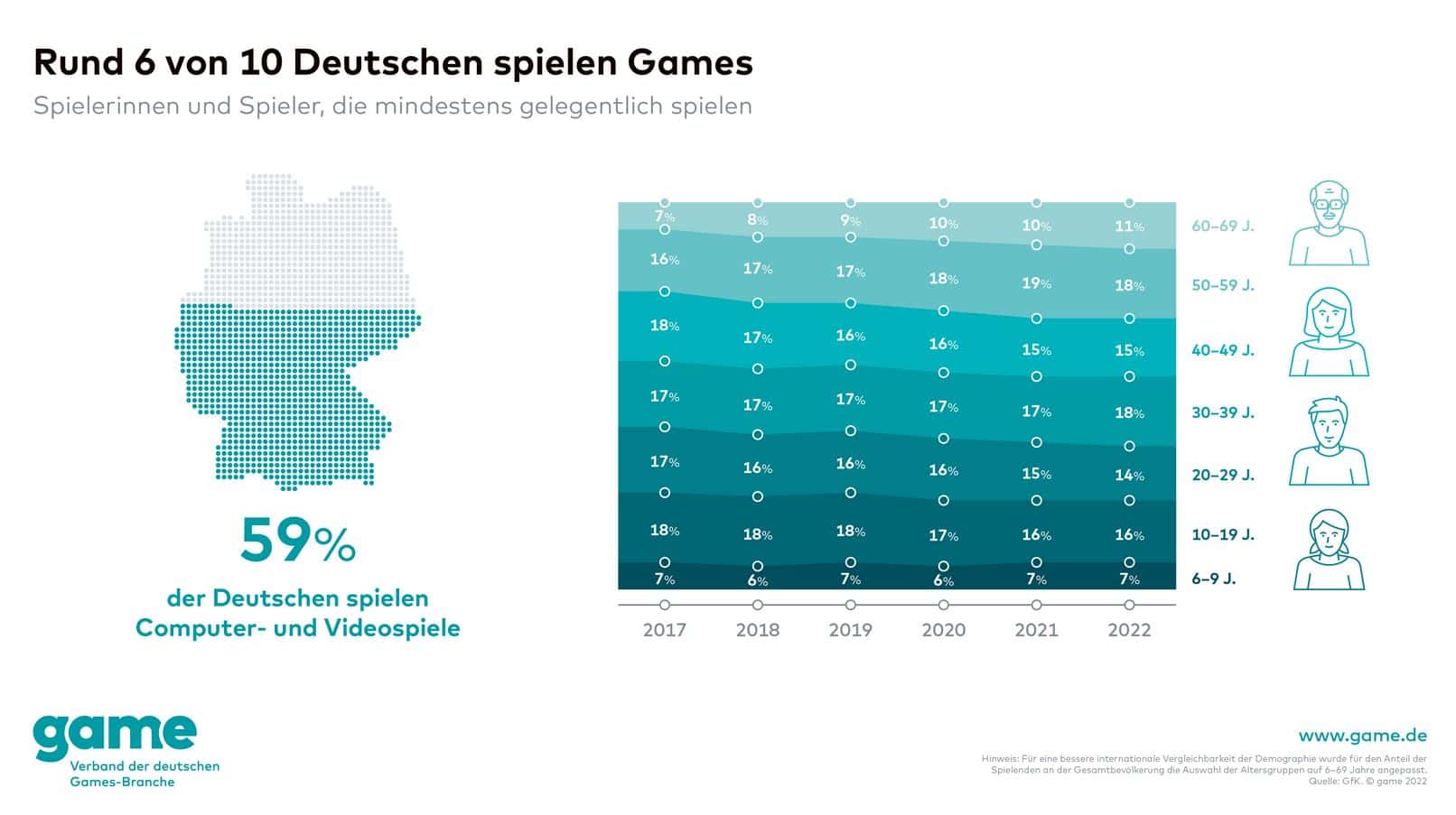 Nach dem starken Wachstum im Corona-Jahr 2020 stieg das Interesse am Gaming in Deutschland auch im Jahr 2021 weiter an. So griffen 6 von 10 der Deutschen (59 Prozent) im Alter von 6 bis 69 Jahren auf PC-, Konsolen- oder Mobile Spiele zurück.