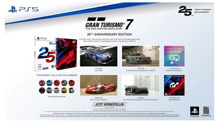 Gran Turismo 7 kann in verschiedenen Versionen für PlayStation 5 und PlayStation 4 vorbestellt werden. Unabhängig von der Version erhalten alle Spieler, die den Titel vorbestellen, folgende Boni: