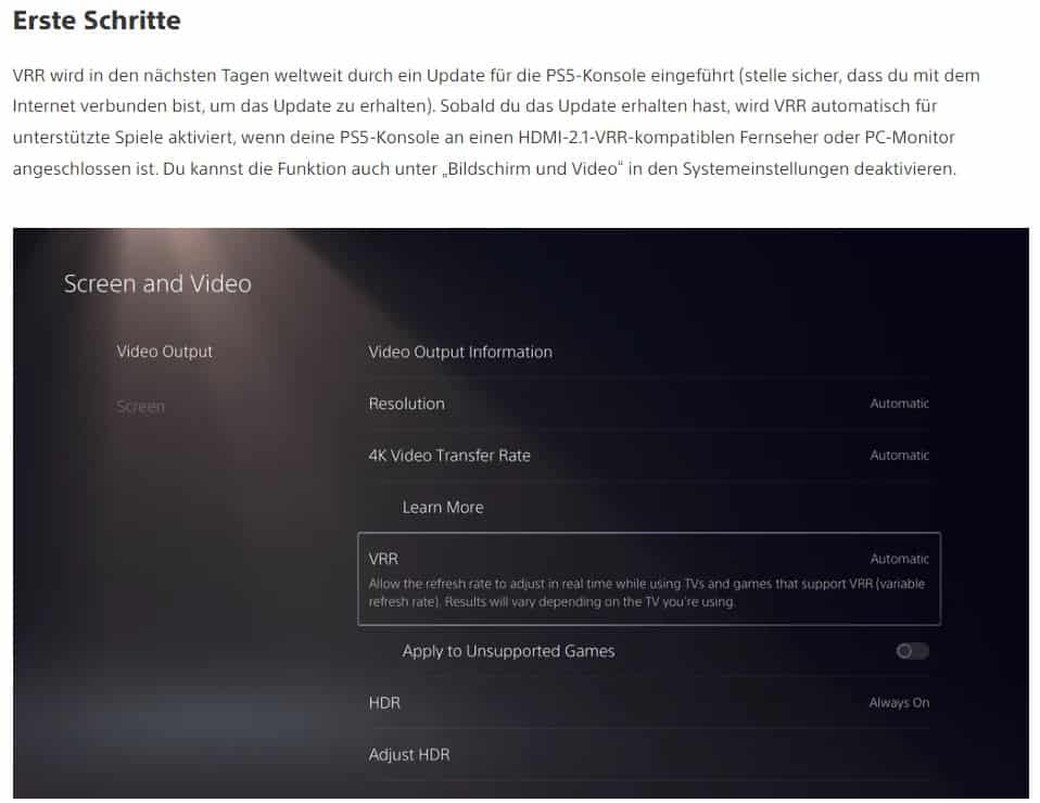 PS5-Update schaltet VRR frei. In den kommenden Wochen erhalten die PS5-Versionen dieser Titel Spiel-Patches, die die VRR-Unterstützung ermöglichen:Das lang ersehntes Grafik-Feature VRR (Variable Refresh Rate) wird laut Sony in den kommenden Tagen auf der PS5 implementiert.