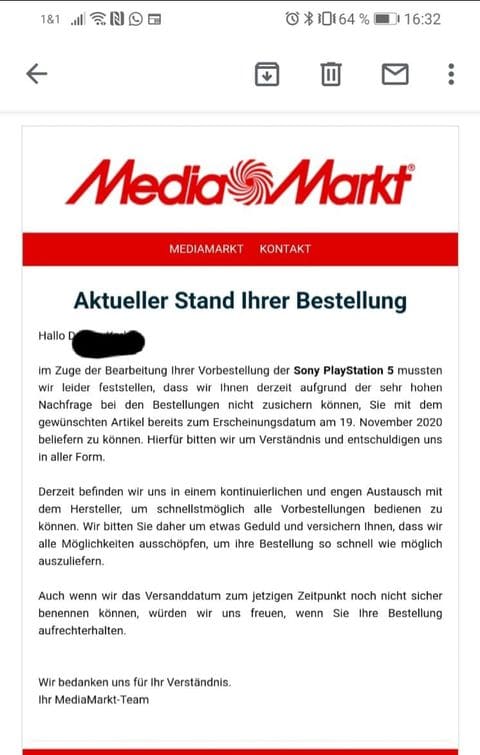 Kunden von MediaMarkt und Saturn dürften im Lauf des heutigen Nachmittags eine Mail im Posteingang vorfinden – zumindest dann, wenn sie im September erfolgreich eine PlayStation 5 vorbestellt haben. Betreff: „Aktueller Stand Ihrer Bestellung“.