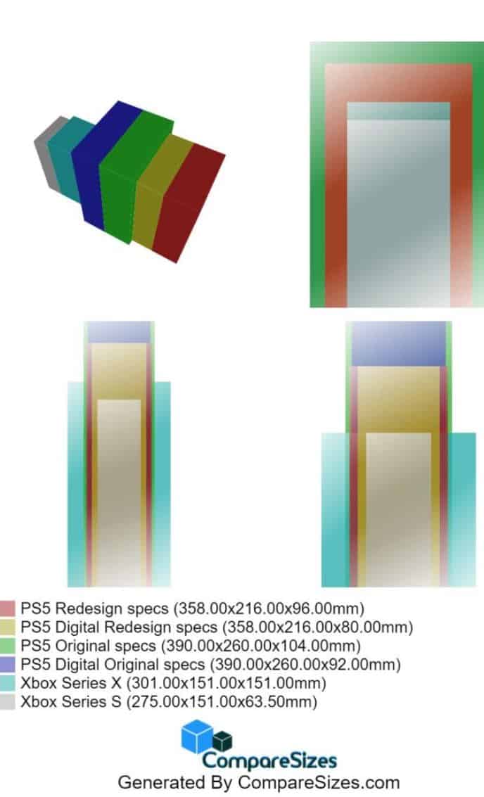 Zumindest bei der Version ohne Laufwerk wirkt die Aufstellung ohne Standfuß optisch etwas instabil, auch wenn die Stabilität weitgehend von der verfügbaren und anscheinend gleich großen Standfläche bei beiden Modellen abhängt. Eine offizielle Empfehlung von Sony für die Aufstellung ohne Standfuß dürfte es wohl nicht geben. Die Redakteure von IGN haben sich etwas genauer damit befasst, auch wenn der Vergleich viel Vorstellungskraft erfordert. Sie haben Blöcke generiert, um die Größen der PS5-Konsolen miteinander zu vergleichen, wobei auch die Xbox-Konsolen berücksichtigt wurden.