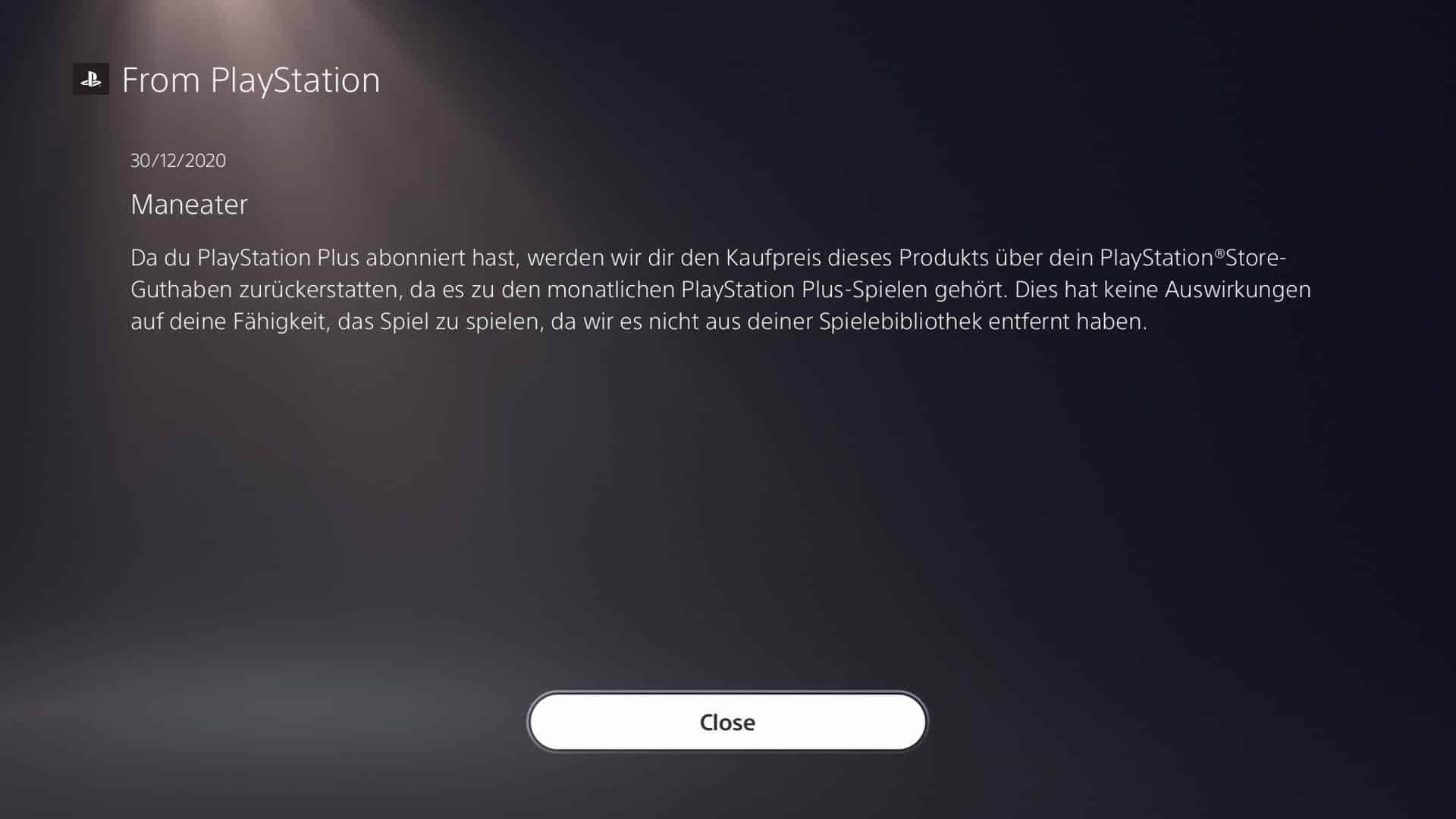 „Da du PlayStation Plus abonniert hast, werden wir dir den Kaufpreis dieses Produkts über dein PlayStation Store-Guthaben zurückerstatten, da es zu den monatlichen PlayStation Plus-Spielen gehört.“