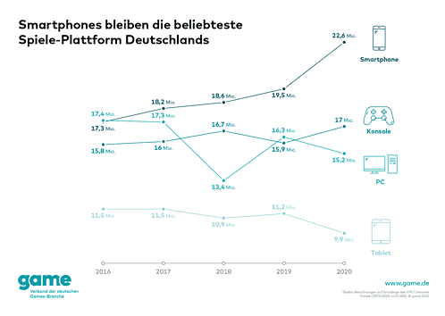Doch nicht jede Spiele-Plattform konnte von dem Spiele-Boom gleichermaßen profitieren: So verlor der PC rund 1,1 Millionen Spielerinnen und Spieler in Deutschland. Mit 15,2 Millionen Nutzenden landet er nur noch auf Platz 3. Auch Tablet Computer waren bei den Gamerinnen und Gamern weniger gefragt: Statt 11,2 Millionen griffen 2020 nur noch 9,9 Millionen von ihnen zu den flachen Touchscreen-Computern, um damit zu spielen.